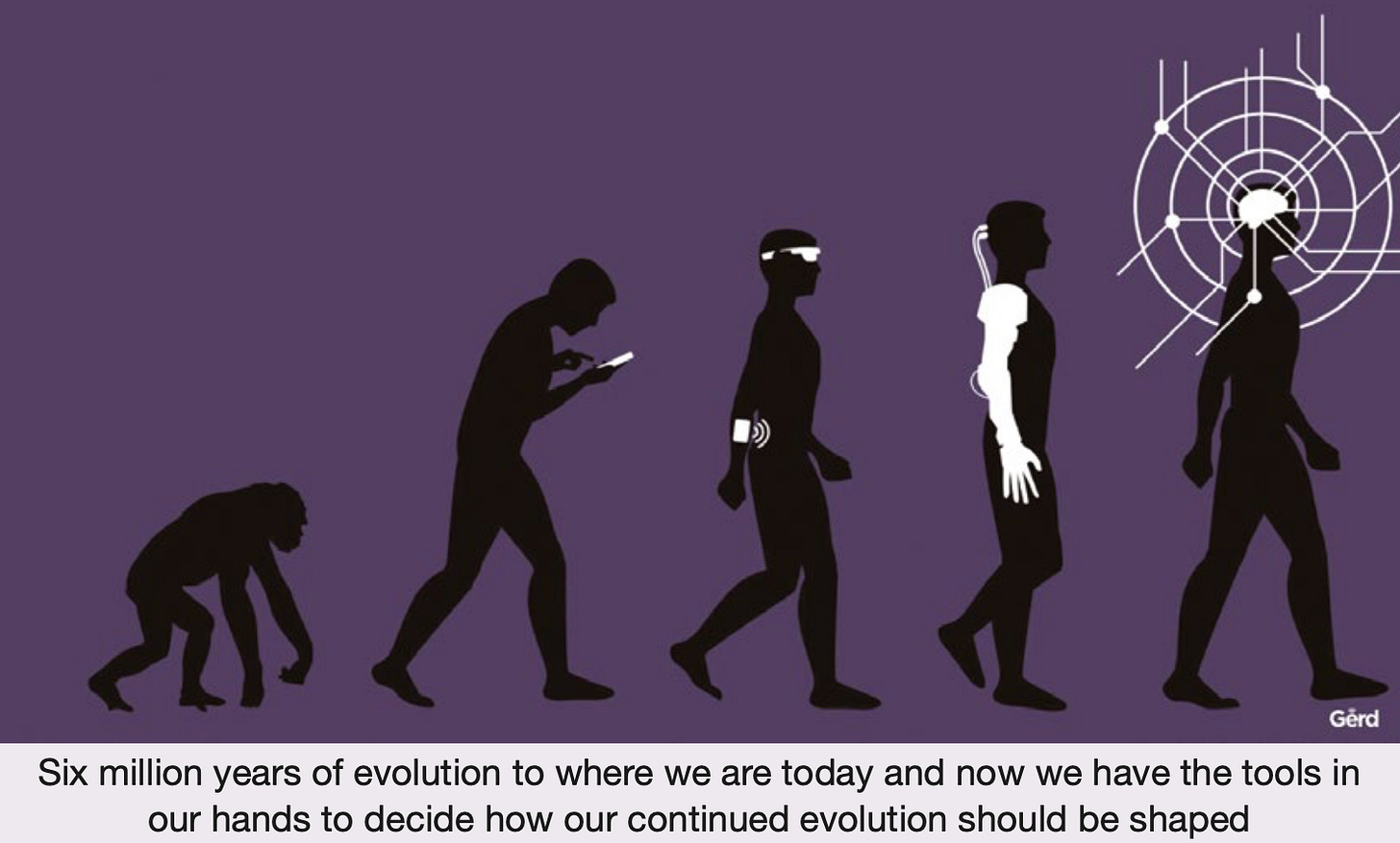 “six million years of evolution to where we are today and now we have the tools in our hands to decide how our continued evolution should be shaped.”