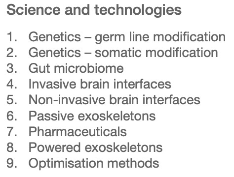 Of course, one of the first questions that must be asked when reading this report is what is human augmentation. An image from the report lists the technologies. The back of the report details these technologies in great detail: