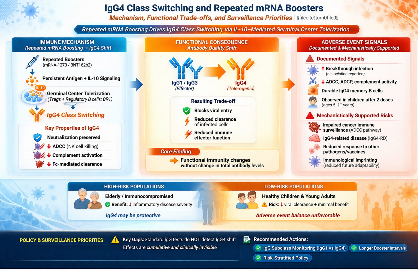 Results: The class switch is mediated by IL-10 signaling within germinal centers, not systemic immunosuppression, but its consequences are durable: IgG4-expressing memory B cells and long-lived plasma cells encode a permanent change in the anti-spike antibody repertoire that manifests with every subsequent viral encounter. Documented adverse events include increased risk of SARS-CoV-2 breakthrough infection (Martín Pérez et al., J Infect 2025), impaired antibody-dependent cellular cytotoxicity (ADCC), complement activation failure, and loss of Fc-mediated viral clearance, confirmed by negative correlations between IgG4 levels and all three Fc effector functions simultaneously (r = −0.39 for neutralizing titers) (Kalkeri et al., J Infect 2025). Potential adverse event pathways with mechanistic support include: impaired immune surveillance of oncogenic pathogens and transformed cells secondary to Fc effector erosion; susceptibility to non-COVID pathogens dependent on IgG1/IgG3-mediated clearance; induction or exacerbation of IgG4-related disease (IgG4-RD) in predisposed individuals; generation of anti-idiotype and autoantibodies with pathological potential; and immunological imprinting that constrains protective breadth against future variant antigens. Pediatric-specific risk is documented: the class switch occurs in children aged 5–11 years after only two pediatric doses.