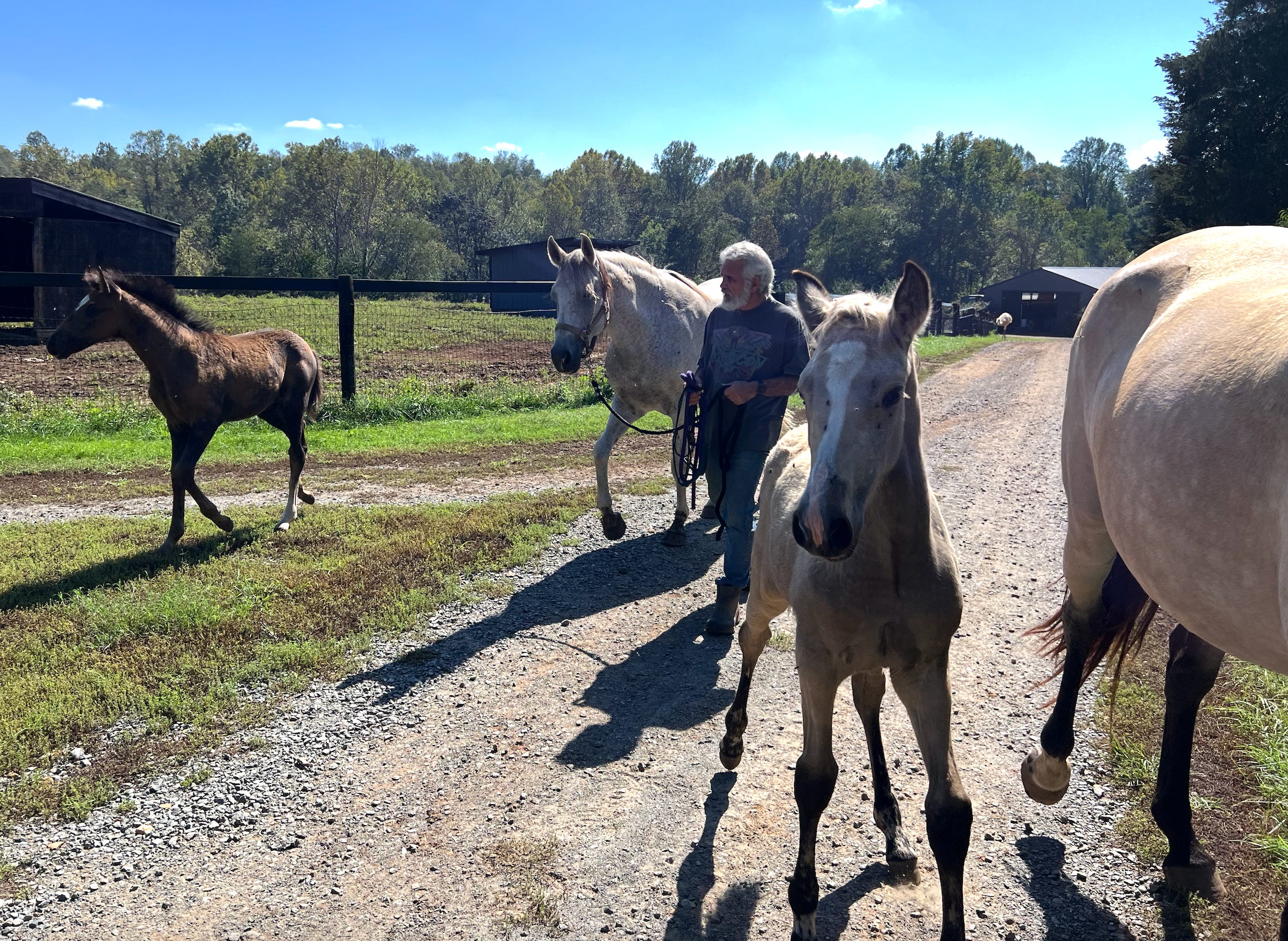 Unfortunately, he got tangled up in the fence wire, as did Onasis, who ran over to try to kill Quartz. I ran as fast I as could to arrive a minute later - to find the two stallions on their backs tangled in the fencing and mud (remember Hurricane Helene) - snapping at each other. Somehow I or they managed to get free. Then we had two enraged stallions trying to kill each other in about a half acre paddock. Jill arrived with halters and a long whip - where we basically stood between them and kept them from killing each other as they reared, kicked, bucked, and generally acted like testosterone-fueled teenagers. There was no haltering those two in the same area. My goal was to keep them apart without taking a kick to chest or back - both of which I have experienced in the past. Yes, broken ribs hurt. For a long time.