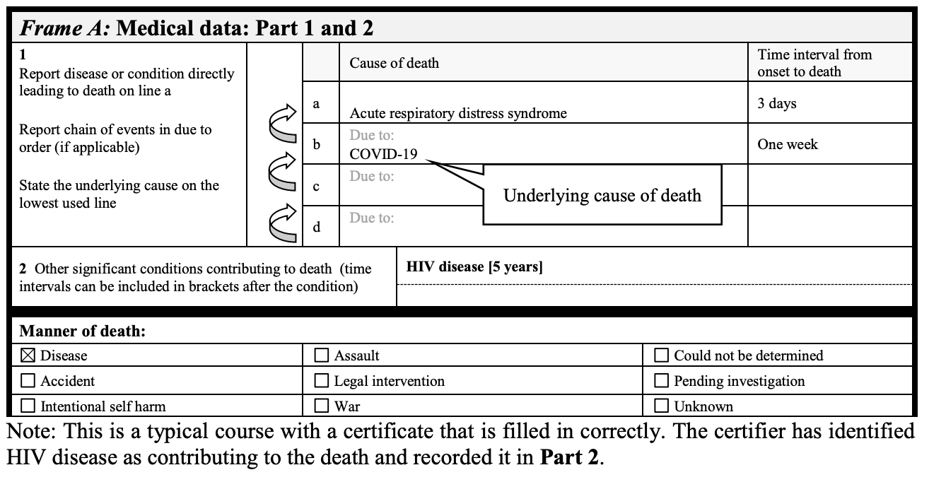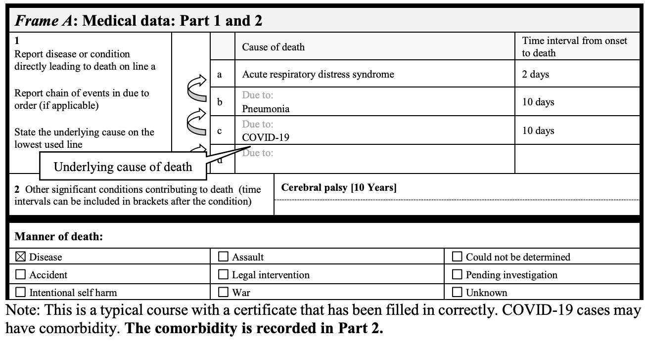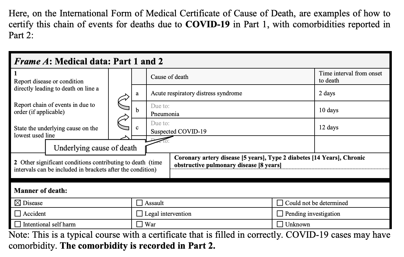 The example above documents that despite the fact that this patient had Coronary artery disease, type 2 diabetes, and COP - WHO advises that on the death certificate, COVID-19 be listed as the primary cause of death. Even without a positive test.