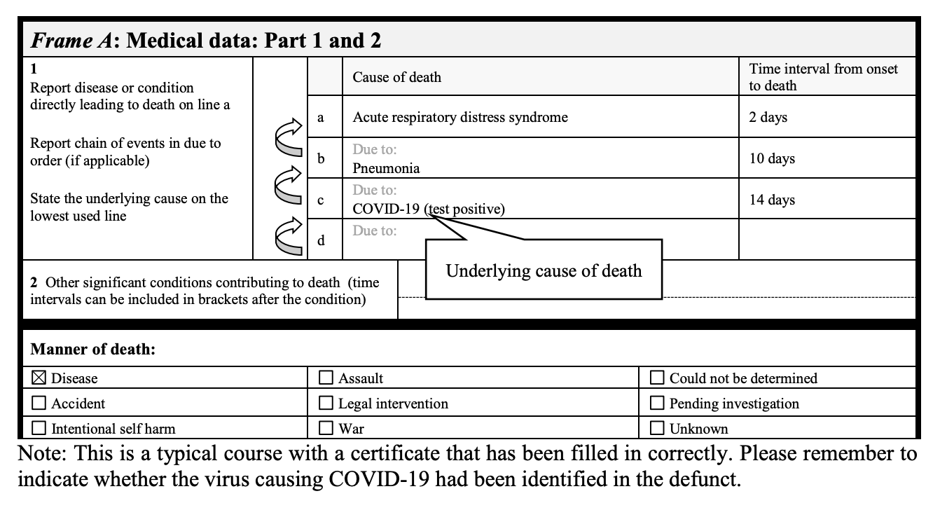 The first example from the document shows that if there is a positive test, the death certificate should be labelled as such. Without such labelling, there would not have been a positive test. This is what a positive COVID-19 test would look like on a death certificate.
