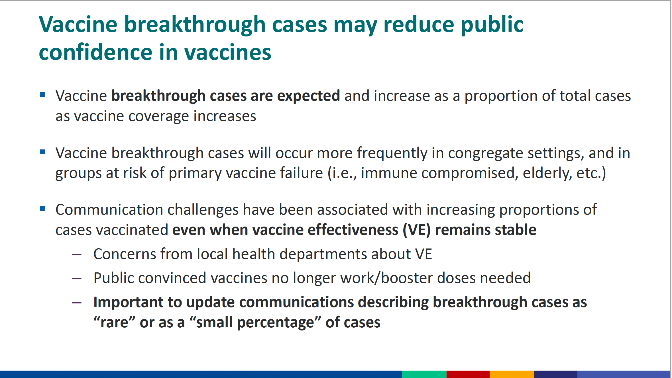 In side #2 of the presentation, the recommended public health messaging challenges and recommendations for wording to be used when communicating with the press and public are highlighted. Review of the following slides #3 to #5 illustrates the CDC focus on COVID-19 clinical outcomes rather than breakthrough infection and transmissibility, and indicates an inflection point in April 2021 beyond which both hospitalization and death endpoints for vaccinated begun to climb. Of interest in slide #4 is the slope of the rise in deaths in the vaccinated is greater than that of the rise in hospitalization. A similar paradox is also seen in the more recent UK datasets concerning Delta infections in vaccinated individuals, and this has been a persistent finding in those data. This trend should be closely monitored, and if persistent and statistically significant, raises concerns that this may indicate signs of antibody dependent enhancement. Given the recent information concerning poor durability of the genetic vaccines (Moderna, Pfizer, J&J), subanalysis of these data based on time post completion of vaccination would be useful (eg, <6 months post, >= 6 months post vax). Such an approach might help clarify the contribution of waning immunity to this effect.