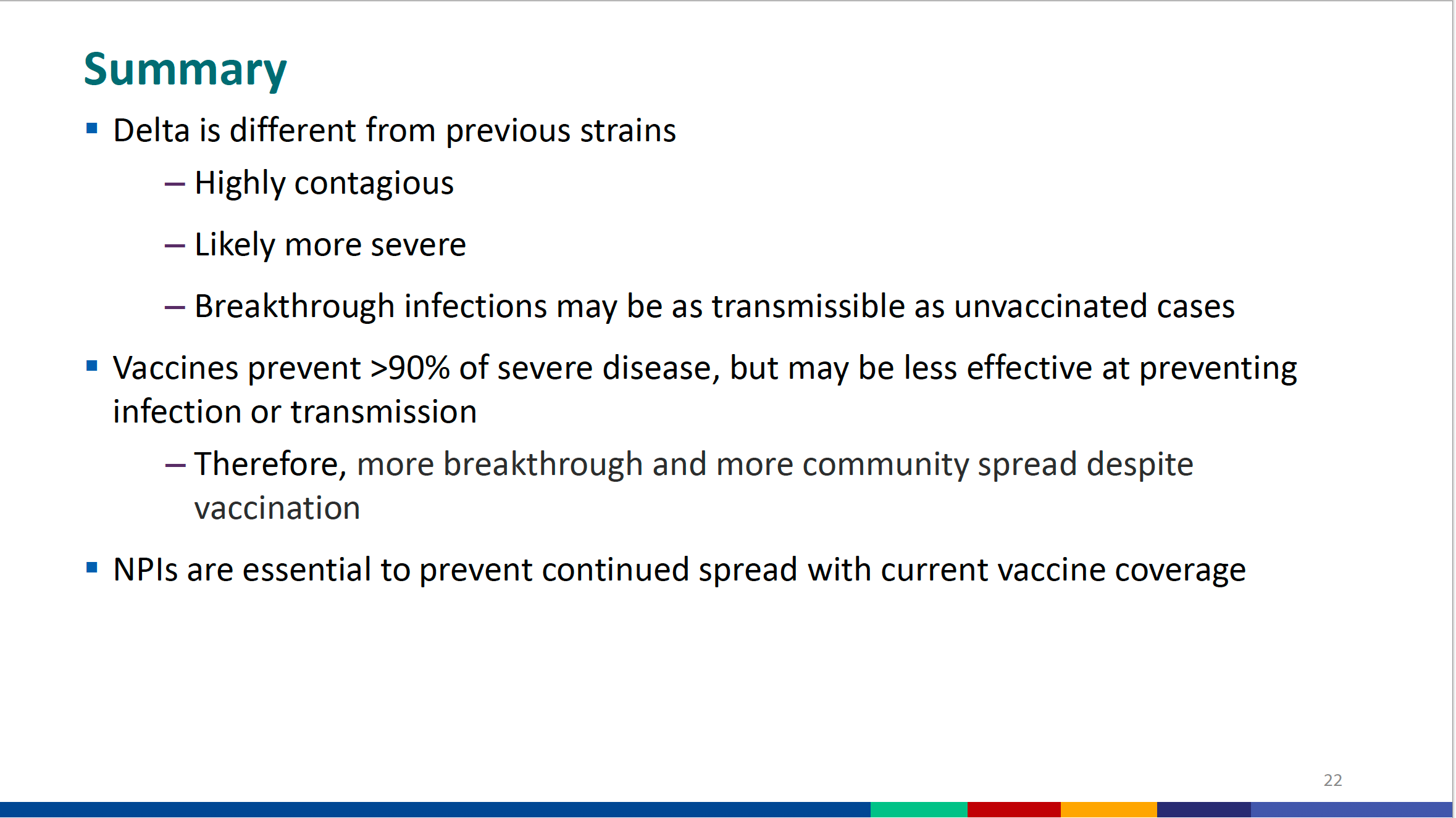 Slide #22 pretty much sums up the bleak situation. Called “Summary” the CDC summarizes the following; 1) Delta is highly contagious and likely more severe (the latter point is contradicted by slide #15 as well as more recent data). 2) “Breakthrough” infection cases are just as likely to infect others as infections of those not previously vaccinated. 3) Vaccination appears to still prevent more severe disease from Delta compared to those who are unvaccinated (however both slide #4 and UK data show a paradoxical increase in death in vaccine breakthrough cases relative to severe disease). 4) Vaccination alone cannot stop the spread of Delta. Non-pharmaceutical interventions (mask use) will also be needed (but the data indicate that even full mask compliance will only slow the spread).