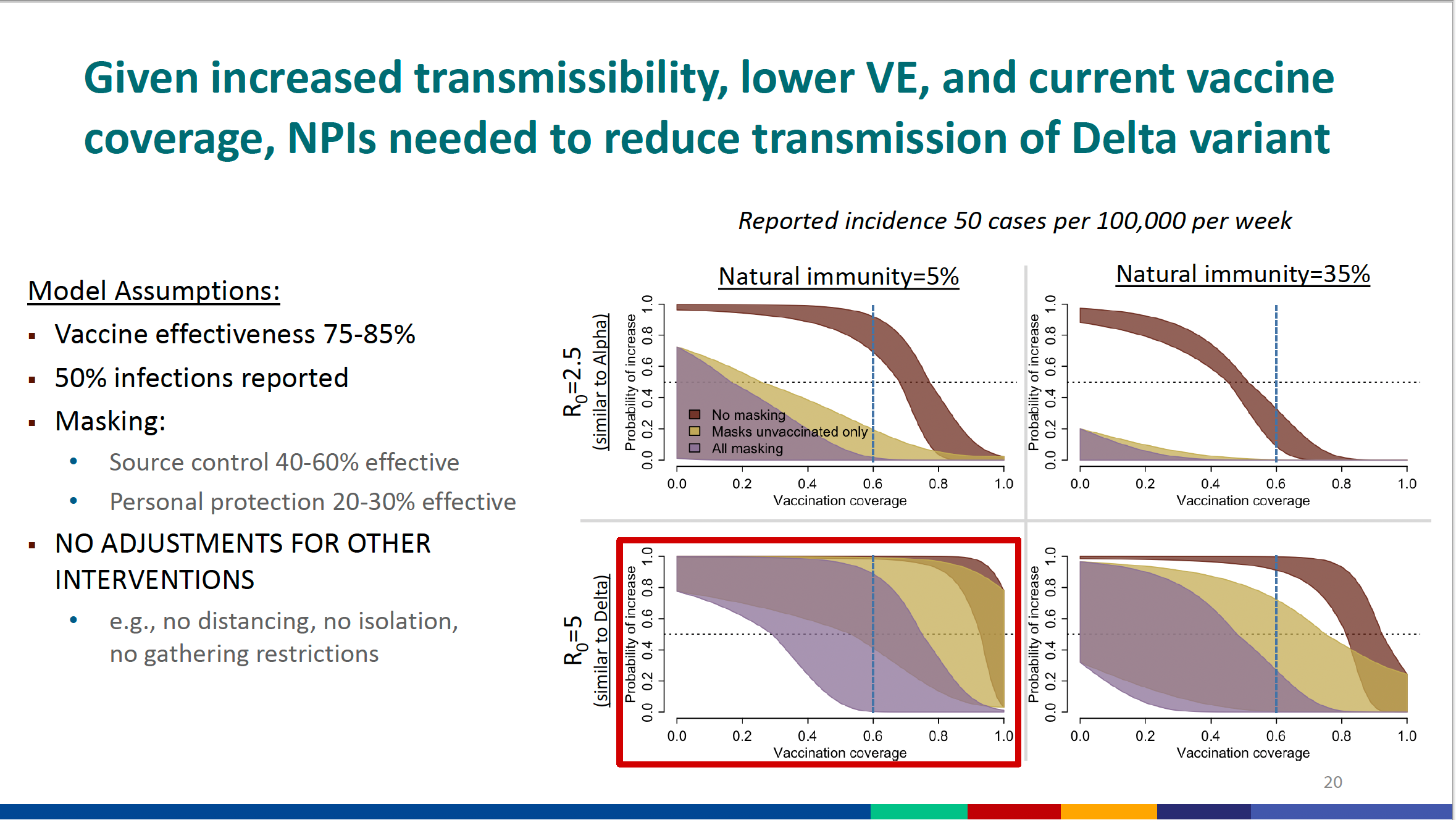 This pair of slides are complicated and difficult to understand for those who have not previously encountered these types of analyses, which may explain why the Washington Post did not discuss the information and conclusions. These represent statistical modeling projections for the potential impact of different intervention options (vaccination and mask use) based on assumptions concerning the reproductive coefficient of the virus, the effectiveness of mask or vaccine use, the extent of vaccine acceptance in the population (uptake), and the fraction of the population which has been previously exposed/recovered/naturally immune due to prior SARS-CoV-2 infection. The NPIs mentioned in the title refers to non-pharmaceutical interventions (ergo masks, social distancing, etc.). The starting point for understanding these projections is to understand the underlying assumptions of the modeling performed; 1) Vaccination is presumed to 75-80% effective in preventing infection (but the most recent data indicate that approximately half that value is a more reasonable assumption). This is a measure of the “leakiness” of the vaccines, which here is assumed to be 20-25%, but is more likely to be about 60%. 2) The Ro is presumed to be 5 for these models (Ro = 2.5 for Alpha), but in Slide #15 we learned that the Delta Ro is 8. 3) “Natural Immunity” from prior infection/recovery is presumed to be either 5 or 35% of the population. 4) The baseline “incidence” of new cases of infection is presumed to be 50 cases/100,000 population/week. 5) The benefits of mask use in preventing infection of those wearing a mask is presumed to be 20-30%, whereas the benefits for blocking virus transmission from infected persons is presumed to be 40-60% effective. The vertical axis projects the probability that the 50 new cases/100,000/week increases based on the modeled interventions (vaccine uptake, mask use). The horizontal axis projects the fraction of the overall population which has been fully vaccinated (eg. 0.6 = 60% vaccine uptake). Based on the “red box” designation, CDC appears to presume that 5% of the overall population currently has “natural protection” from prior infection and recovery. The darker brown curve represents the probability range of viral spread (increase) if no mask use (vaccine intervention alone). The mustard-colored curve reflects the modeled effect of just masking the unvaccinated. The purple curve indicates the modeled effect of masking on both vaccinated and unvaccinated. These mask effectiveness ranges are the reason why the curve plots are so broad, rather than just being a single line. Based on the flawed assumptions used (those flaws being that Ro is actually 8, not 5, and vaccine effectiveness is more like 40%), these projections indicate that at approximately 60% vaccine uptake (also a bit optimistic at this point), in the absence of mask use the Delta variant has an approximately 100% probability of spreading at greater than 50 cases/100,000/week. If only the unvaccinated were to wear masks, the probability of seeing further spread ranges from 40 to 100%. If both vaccinated and unvaccinated practice optimal mask use, the probability of further Delta viral spread ranges from 0 to 90%. From this analysis (Slide # 22), the CDC concludes that “Given higher transmissibility and current vaccine coverage, universal masking is essential to reduce transmission of the Delta variant” (below 50 cases/100,000/week). Based on these projections, it appears that if the more realistic variables of Ro =8, 40% vaccine effectiveness, and suboptimal mask use are employed, it is unlikely that the eventual spread of the Delta variant through the general population can be controlled even with considerably higher uptake of these leaky vaccines and perfect mask compliance.