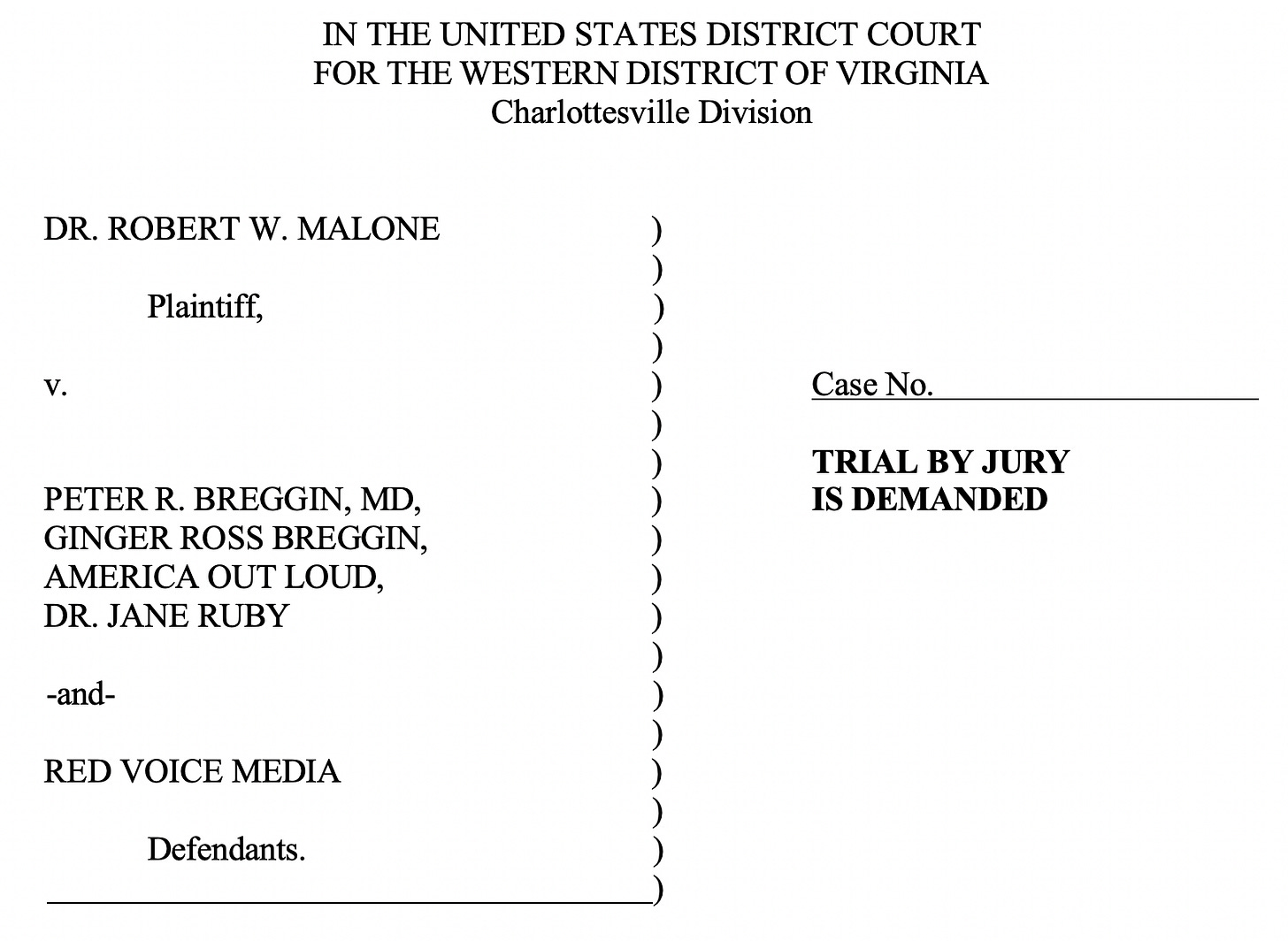 Plaintiff, Dr. Robert W. Malone (“Plaintiff” or “Dr. Malone”), by counsel, pursuant to Rule 3 of the Federal Rules of Civil Procedure (the “Rules”), files the following Complaint against Defendants, Peter R. Breggin, M.D. (“Breggin”), Ginger Ross Breggin (“Ginger Breggin”), America Out Loud, Dr. Jane Ruby (“Ruby”) and Red Voice Media, jointly and severally.