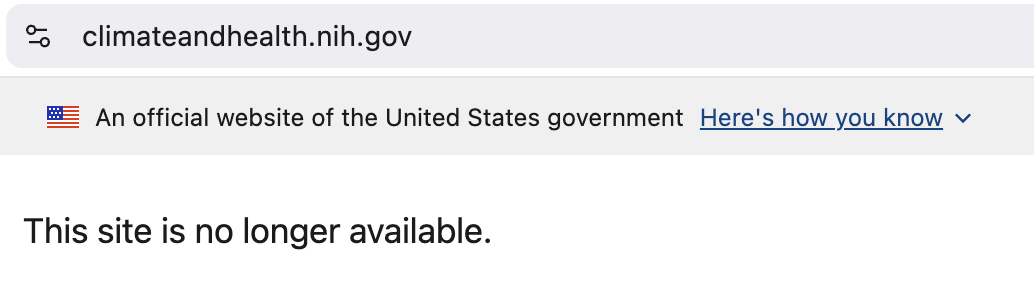 The Climate Change and Health Initiative has now been removed from the HHS website, because the NIH Climate Change and Health Initiative is being dismantled. On February 14, 2025, Robert F. Kennedy Jr. ended HHS funding for the initiative, likely terminating its work.