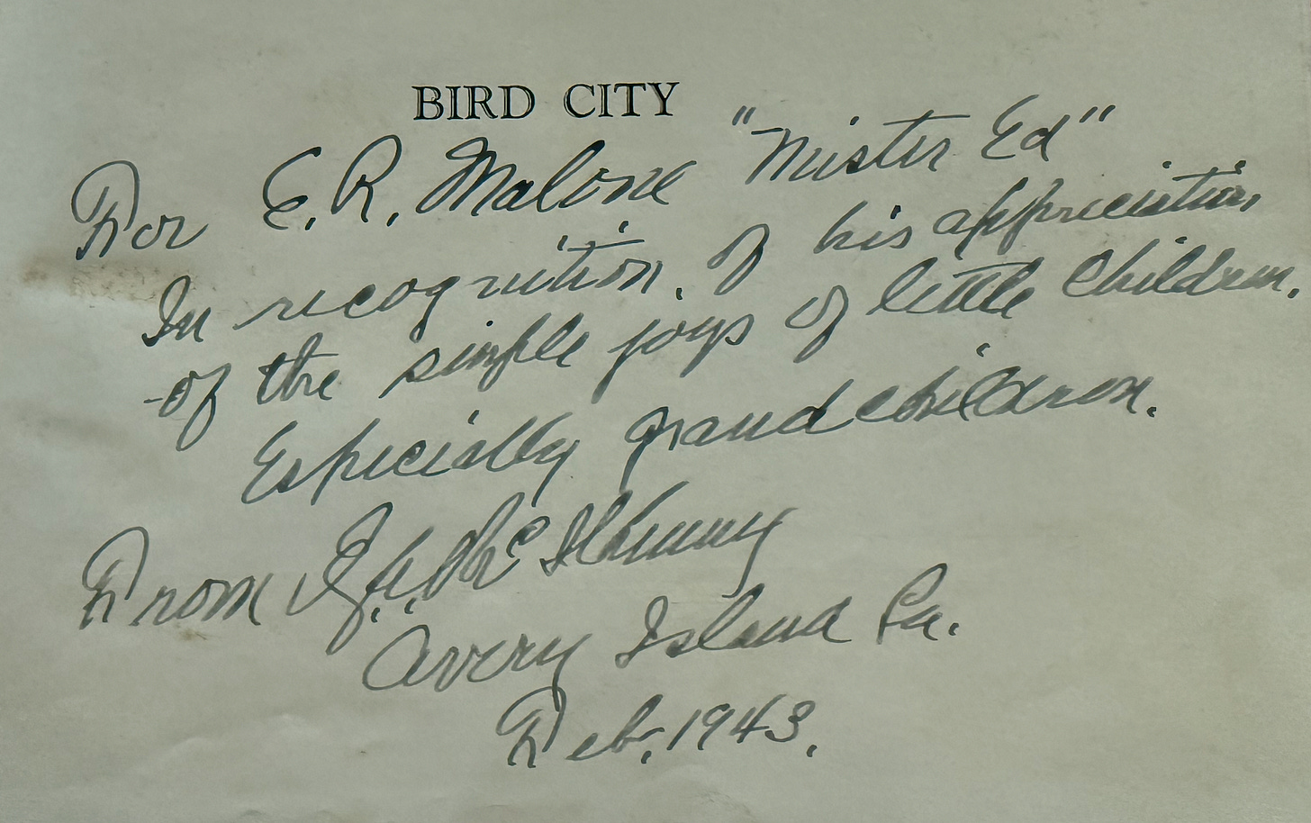 Because my family’s copy of “Bird City” has the following personal note written to my grandfather and indirectly references my father as a child, I have kept the book in our main office.