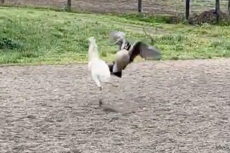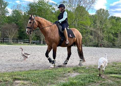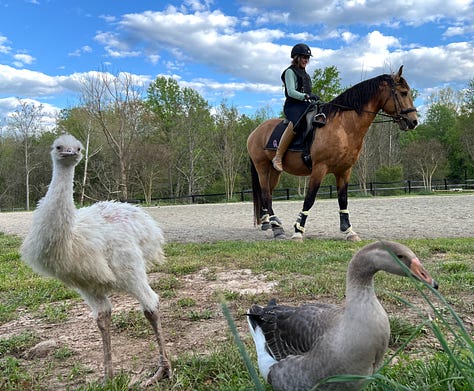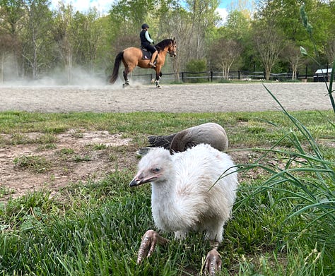 Then the wild goose started hanging out in the arena too. At this point, Gizmo decided that the wild goose was just not ok. That this particular wild goose is not a trustworthy animal and is not a friend! So, just as we had hoped Gizmo would do, he suddenly morphed into being a guard-emu. While Gonzo (our goose) and Olivia (our extraordinary farm manager) watched, Gizmo let the wild goose know he is not invited to the party.