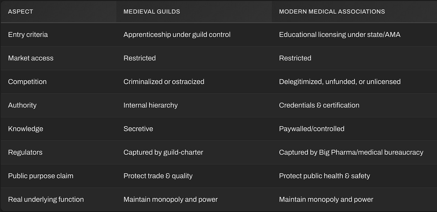 The medieval Guilds and the modern medical boards and societies share the same soul: an oligopoly draped in moral virtue. Both arose from the belief that unregulated chaos harms people, but both evolved into self-sealing monopolies that suppress creative dissent, alternative innovation, and independent thought.