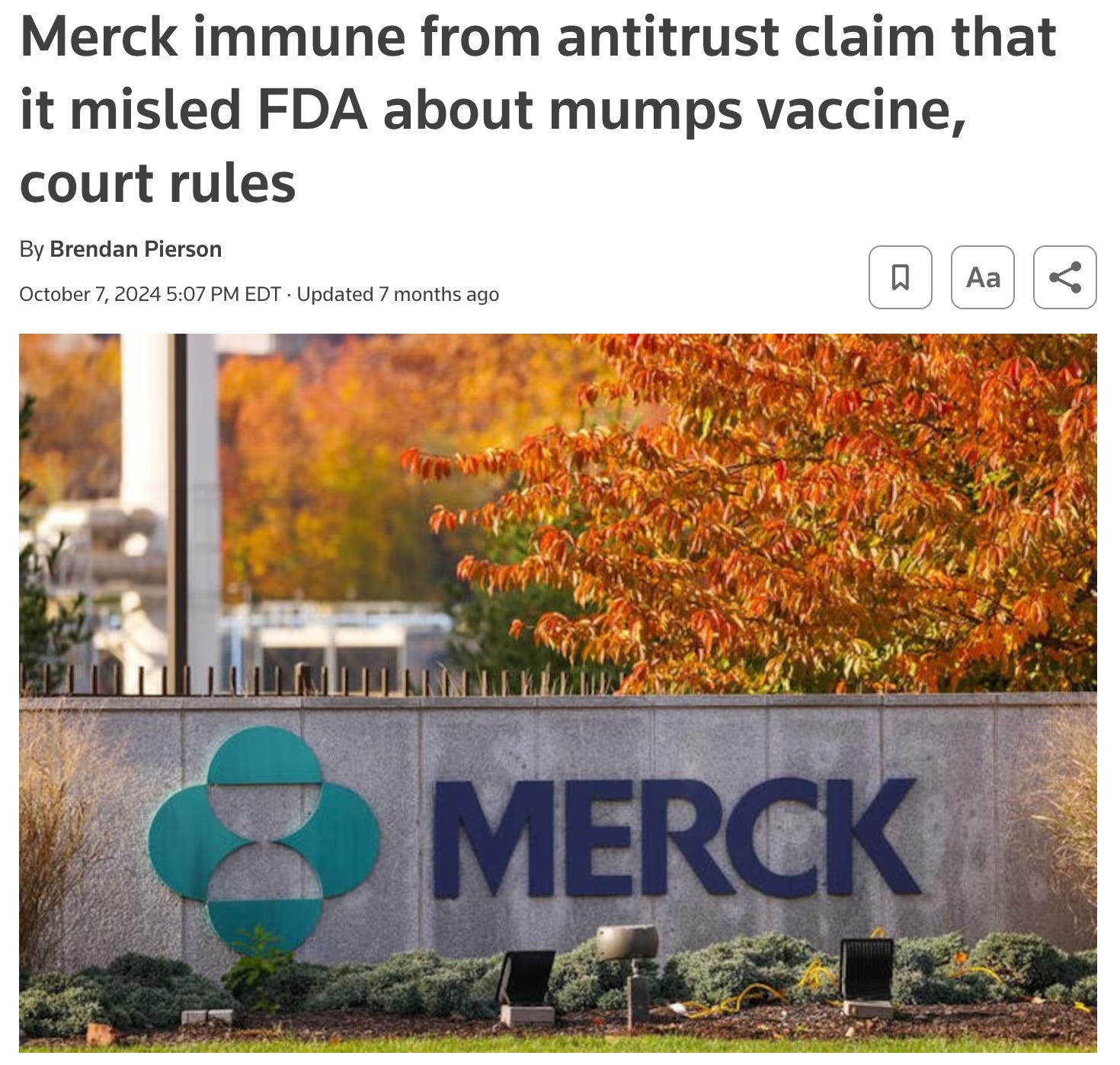 Oct 7 (Reuters) - Merck (MRK.N), is immune from an antitrust lawsuit accusing it of misleading regulators about the effectiveness of its mumps vaccine in order to ward off competition, a federal appeals court ruled on Monday.