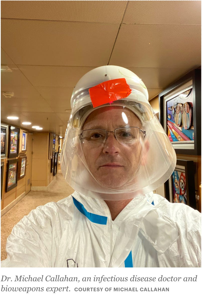 Clearly this story told by Borrell is a limited hangout, as was his prior April 26, 2020 story that Callahan had examined a series of 6,000 Chinese cases during that time and discovered the activity of Famotidine as a COVID-19 treatment. I know for a fact that he never used Famotidine to treat COVID-19 while he was in Wuhan or later when he was managing the Diamond Princess outbreak and setting up the portable hospital in New York City, and only began looking into the potential efficacy after I reported to him on the findings of the group that I was leading (and my own personal experience self-treating with Famotidine when I was infected during the Boston Wuhan-1 outbreak at the end of Feb 2020). To this point, when this false narrative was published in Science magazine, I requested from Borrell, Callahan, and Science Magazine a copy of the database which was purportedly used to make this discovery, and none of these were able to provide it. I once asked Borrell if he was also CIA, or as Callahan often says “a member of the secret handshake club”. Borrell denied any association, but there is no question in my mind that for some inexplicable reason Borrell has been publishing Callahan’s cover stories for many years. Like this one for example: “95,000 stranded at sea: What happens when a cruise ship becomes a hot zone”. After returning from China to report to his longstanding close associate Dr. Bob Kadlac (then serving as the Assistant Secretary of Preparedness and Response to the Trump administration), back in Washington DC, Callahan was then deployed to help managing both the Diamond Princess outbreak during the first week of February, 2020, as well as the March 08 Grand Princess outbreak. Which would mean that he would have arrived in Nanjing, China under cover of his Harvard appointment, beginning 22 Jan traveled to Wuhan and managed between 200 and 600 COVID-19 patients, emailed Bob Kadlac on Jan 28 alerting him of the emerging threat (weeks after he had called me), escaped Wuhan by boat returning to Nanjing, continued to monitor hospital COVID-19 management practices remotely from Nanjing, returned to Washington DC to report to Kadlac, and then deployed to the Diamond Princess in Japan during the first week of February. And during this time, was supposedly was involved in a detailed statistical analysis of a 6,000 patient Chinese database (which no one else has ever seen) to discover that Famotidine is active against COVID-19. I know from personal communication with Michael that he then designed and managed deployment of the tent hospital in NY City, and then deployed to manage and set US policy for COVID-19 treatment and infection control in nursing homes. I also know that he presented the data from our research group at White House and WHO meetings as the support for advocating for Famotidine as a COVID-19 repurposed drug treatment, but did not present data from the ephemeral 6000 person Chinese data base analysis.