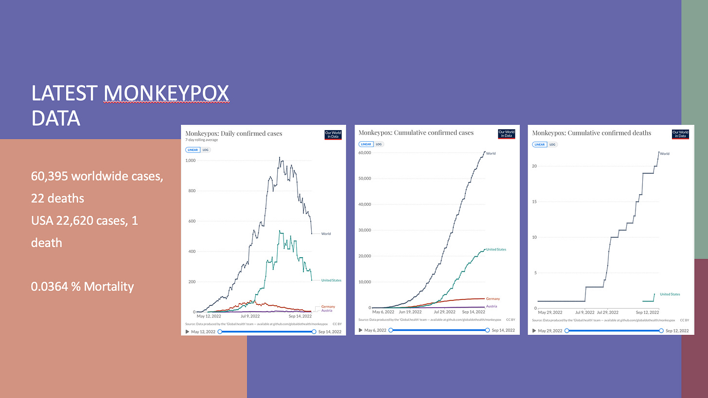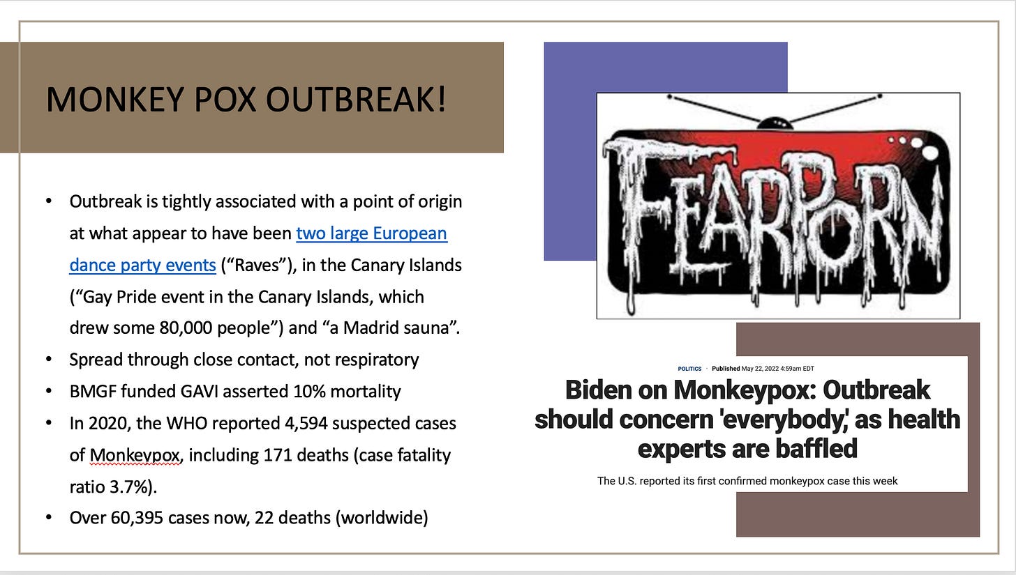 During many speaking engagements, I cover the MonkeyPox story as an example to illustrate the exploitation of fear in the context of media and public health. I think it is such a clear cut case study that it is very useful in helping audiences understand how the media and governments (and the WHO) have learned to exploit public health for various purposes.