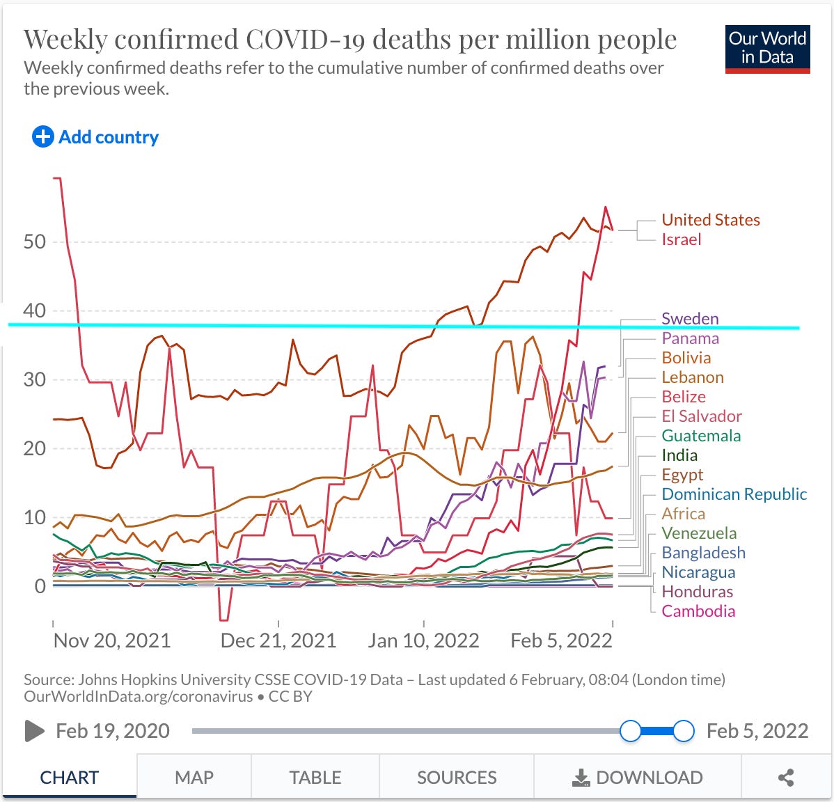 For fun, I took the countries that reportedly use Ivermectin country-wide and compared them to the USA, Israel and Sweden. I chose a three month cut-off, although the results were extended further. I did this because I don’t know when some of the countries began ivermectin use.