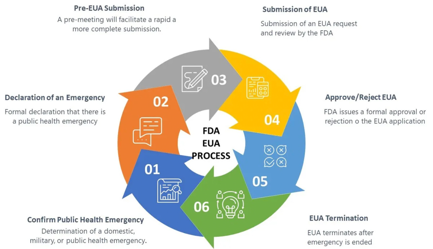 EUA is a process defined by US federal law (21 U.S. Code § 360bbb–3 - Authorization for medical products for use in emergencies) which in the case of these mRNA-based products involves biological products which are not approved, licensed, or cleared for commercial distribution. Specifically, the statute authorizes “the introduction into interstate commerce, during the effective period of a declaration under subsection (b), of a drug, device, or biological product intended for use in an actual or potential emergency.” Continued “Emergency Use Authorization” of these vaccines requires “a determination by the Secretary of Homeland Security that there is a domestic emergency, or a significant potential for a domestic emergency, involving a heightened risk of attack with a biological, chemical, radiological, or nuclear agent or agents”. Once the domestic emergency has passed (ergo “a determination by the Secretary, in consultation as appropriate with the Secretary of Homeland Security or the Secretary of Defense, that the circumstances described in paragraph (1) have ceased to exist”), “A declaration under this subsection shall terminate”. In other words, when there is no longer an emergency, the “Emergency Use Authorization” for the product will cease, and the vaccine products will return to their status as not approved, licensed, or cleared for commercial distribution. These products remain experimental, and are only to be used for a limited amount of time during an ongoing emergency.