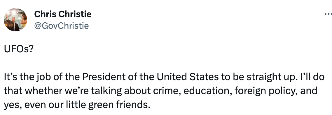 Courage, indeed. And knowledge. Candidates need to be briefed on this, and I know that any ufologist would be only too delighted to provide such information. In fact, in response to Gov Christie’s tweet, a few folks on Twitter-X offered with this helpful primer for any presidential aspirant: