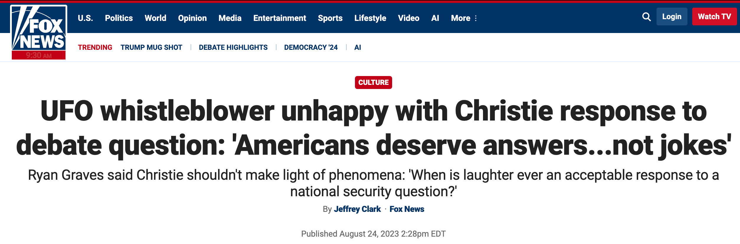 "When is laughter ever an acceptable response to a national security question?" Graves wrote, referring to Christie's flippant response to the question. “Advanced UAP present a clear and present national security problem, so I invite Gov. Christie and any presidential candidate to meet with Navy pilots who have witnessed advanced UAP that exceed our tactical jets. Americans deserve answers and transparency, not jokes about aliens that perpetuate stigma and suppress reporting.”