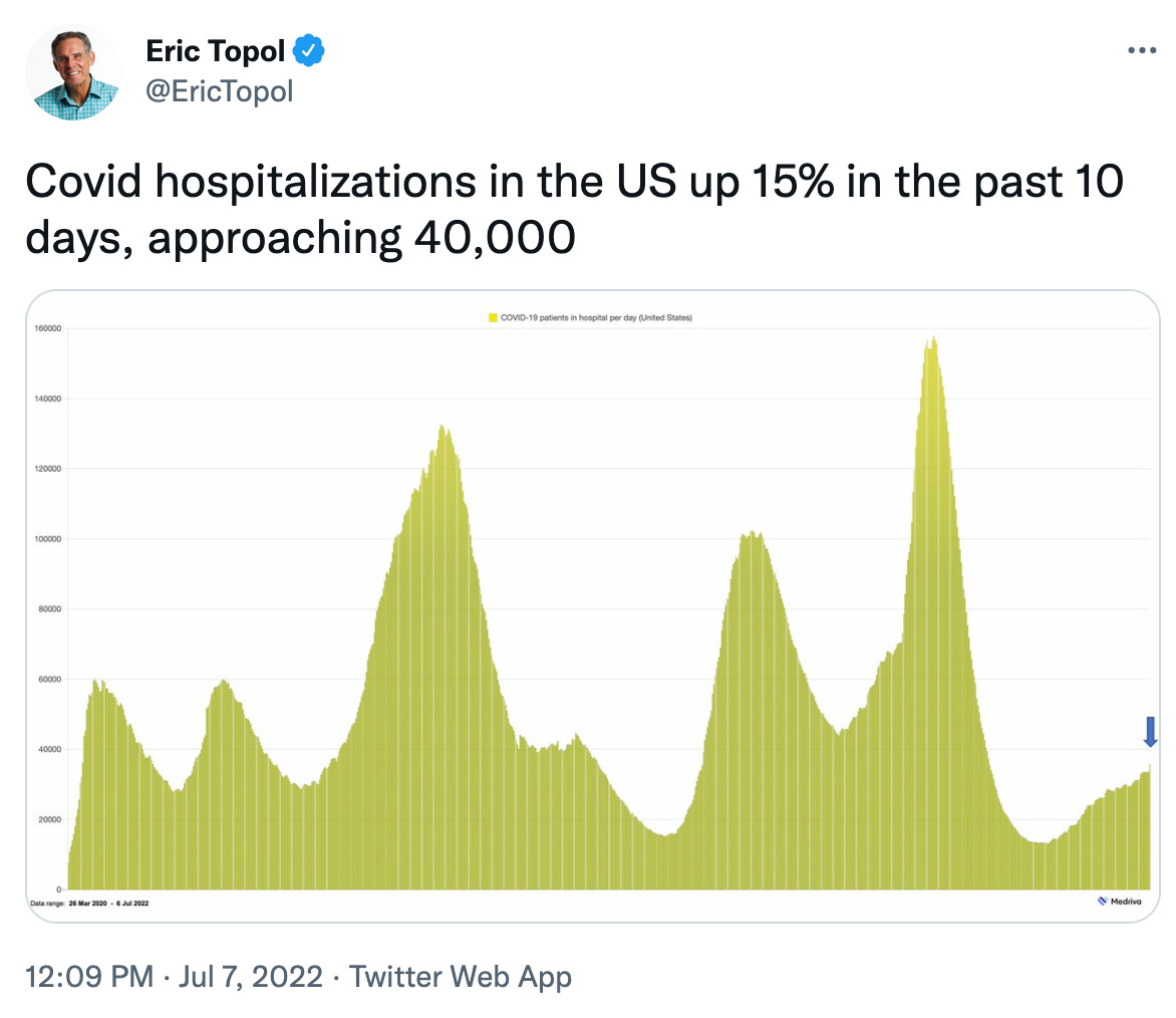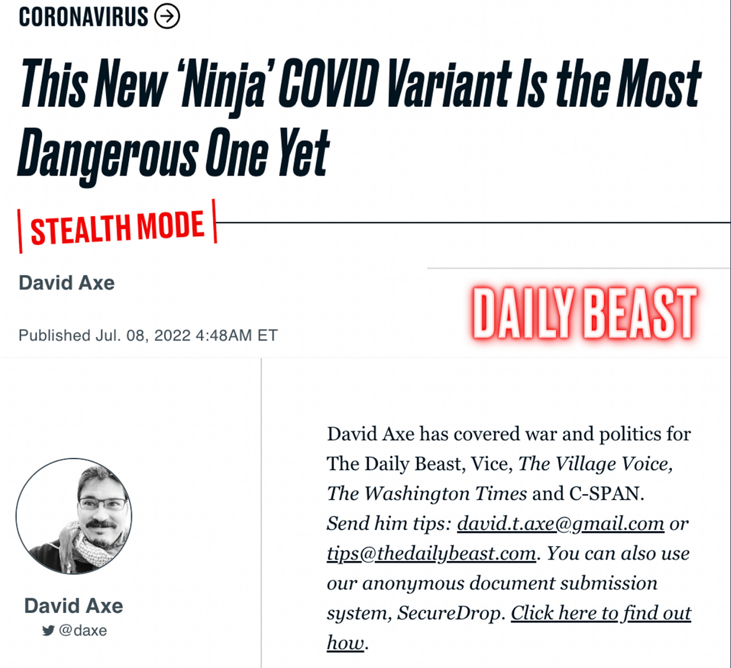 The US Government has now executed a $3.2B contract to Pfizer (using borrowed fiat currency, of course) for purchase of mRNA vaccines designed to address the new Omicron subvariants (BA.4 and BA.5) which will apparently include mRNA coding for Spike proteins from Wuhan-1, Omicron BA.4, and Omicron BA.5. This must be a serious threat, this BA.4 and BA.5 right? Citing Eric Topol’s recent Fearporn substack, the Daily Beast hyperventilates with this piece entitled “This New ‘Ninja’ COVID Variant Is the Most Dangerous One Yet”. Are you sufficiently scared yet? Resistance is futile. You will be assimilated.