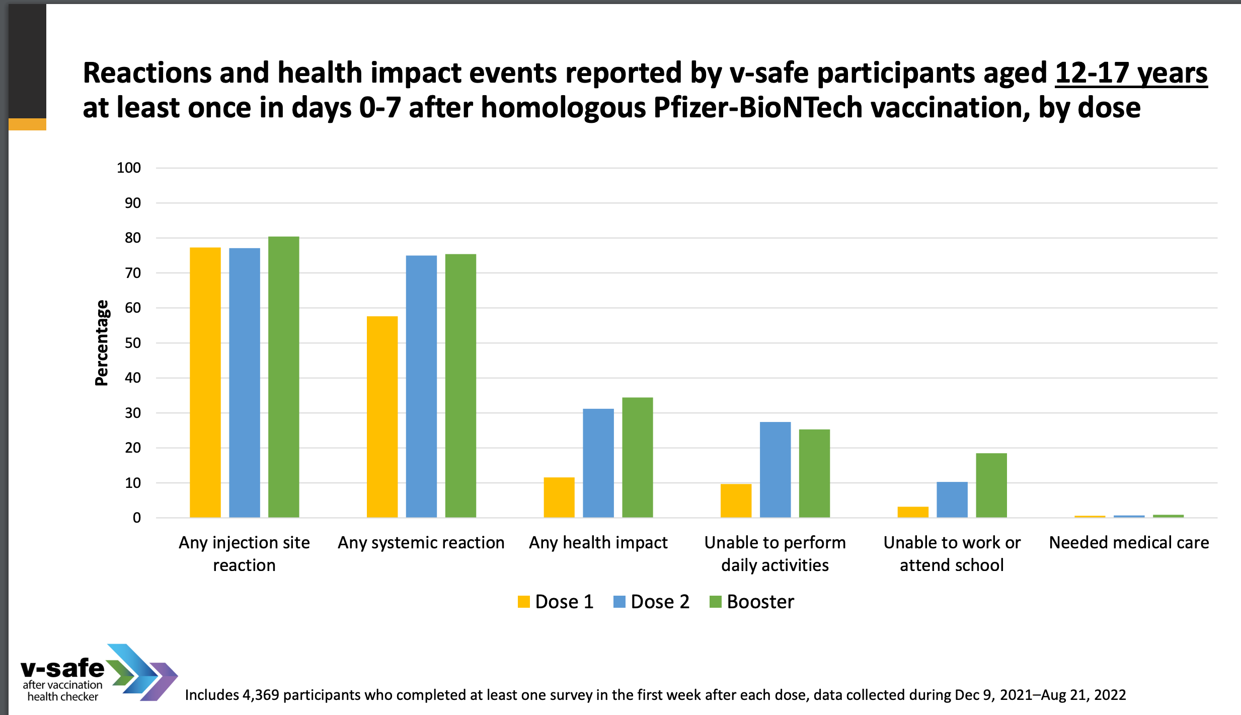 Yeh - so the FDA literally does’t have any data for this bivalent booster for this age cohort but they are making it available under emergency use authorization anyways. We do know based on the ACIP /CDC slide deck from the Sept 2022 ACIP meeting, that there were significant side effects of this vaccine in older children. THESE DATA ARE FROM THE CDC. Of course, there are many unbiased studies that show even more significant adverse events.