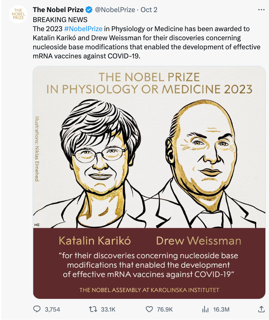 First off, congratulations to Drs. Kariko and Weissman. This award comes on top of having received the Lasker award, and similar awards from the governments of Spain and Israel.