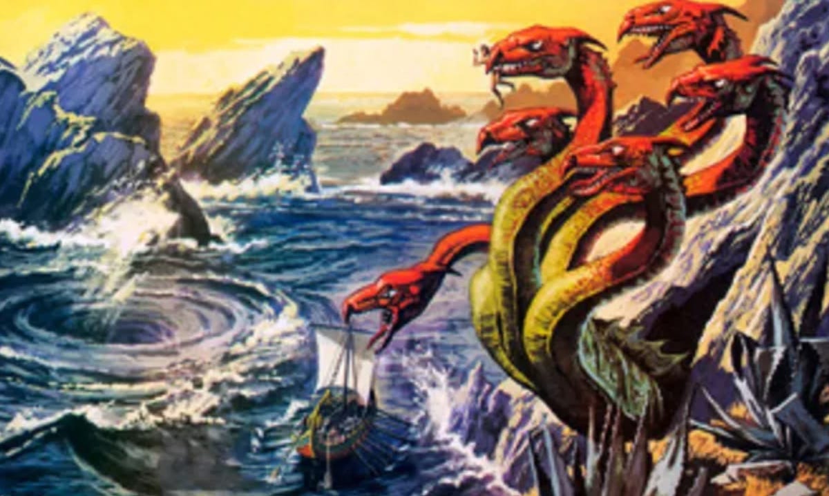 Now, Odysseus was an expert, right? At first, like many modern experts, he was completely dismissive about the risk. He said, "Come on. I'm an expert. There's no risk here," and he denied, denied, denied. He said, "No, there's no risk here whatsoever." Then, eventually he finally realized that there was a risk, he switched to "Okay, fine. There's a risk, but the whirlpool, it's transitory, and we don't really need to worry about it" and insisted that he was going to be able to properly navigate both himself and his crew through this risk. It wasn't going to be any problem. Finally, he eventually realized "Oh my God. This is actually a really big deal." And at that point he was forced to make a very difficult decision. He would have to choose between the two evils, and he chose the lesser of the two. He chose, of course, Scylla, the six-headed monster.