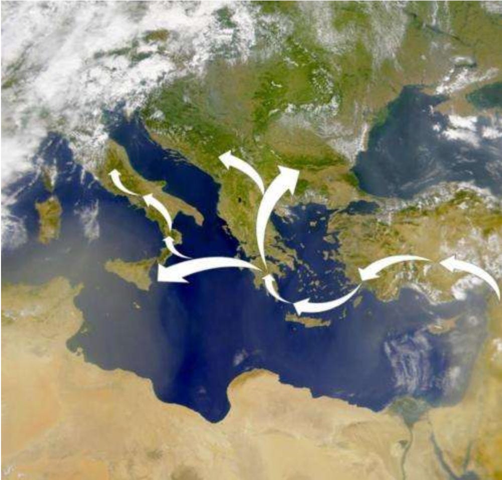 I will start this essay with some big picture ideas, as I often do, hoping to synthesize a lot of things that I have been discussing in prior presentations. And, as is typical for me, we'll start by going back in time. This time I want to start by focusing on events which occurred around 7,000 years ago in the Peloponnesian Peninsula region of ancient Greece. Now, this is so long ago. This is thousands of years before Socrates and Aristotle.