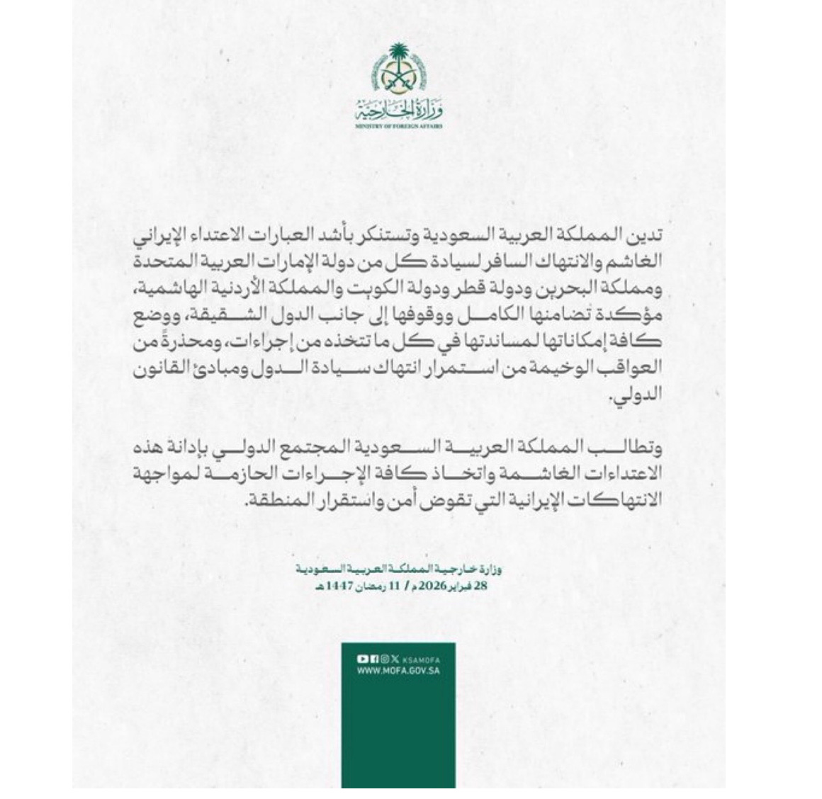 The Kingdom “condemns and denounces in the strongest terms the treacherous Iranian aggression.” It calls the missile strikes a “flagrant violation of the sovereignty” of the UAE, Bahrain, Qatar, Kuwait, and Jordan. It pledges “full solidarity” with every attacked nation. And then the line that changes everything: Saudi Arabia is “placing all its capabilities to support them in all measures they take.”