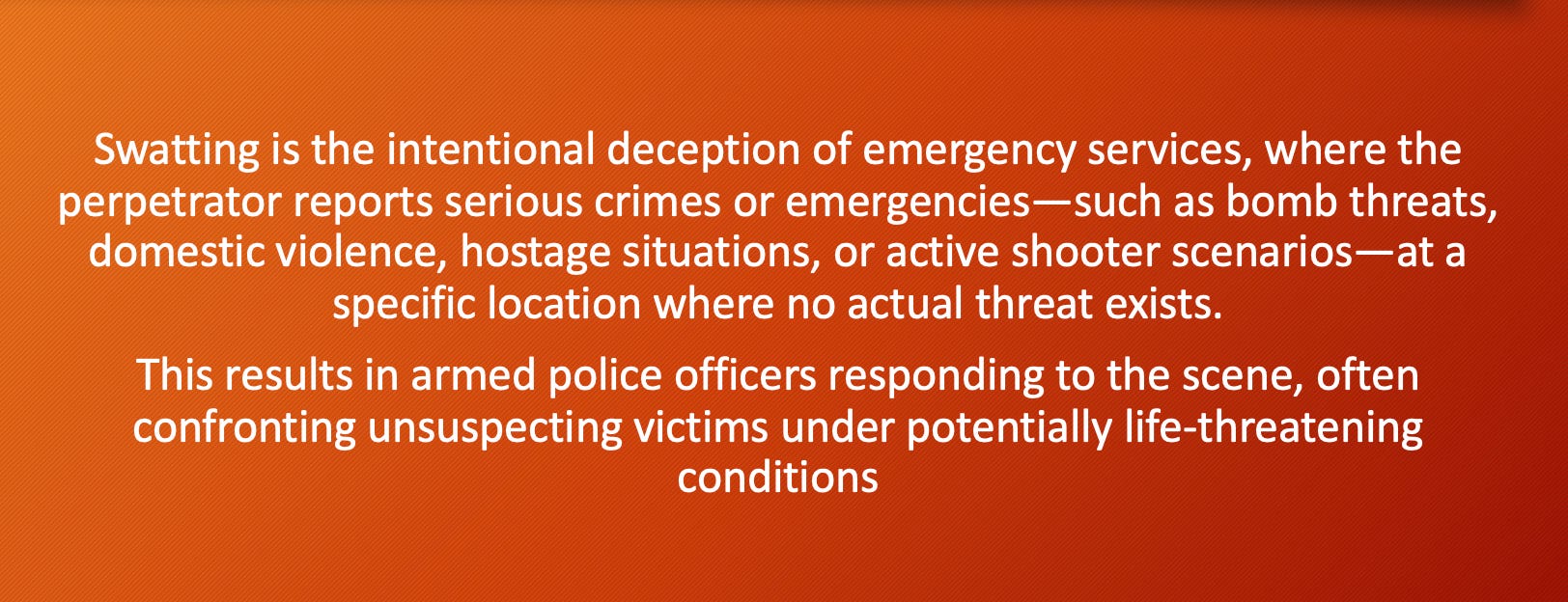 Getting "swatted" has become a leftist method of attacking those who challenge their narratives with facts and truth. Facts and truth are a threat to vacuous leftist fantasies- and are- at the very least called "misinformation"- at worst, "swatted", their property destroyed, jailed, or their dogs killed.