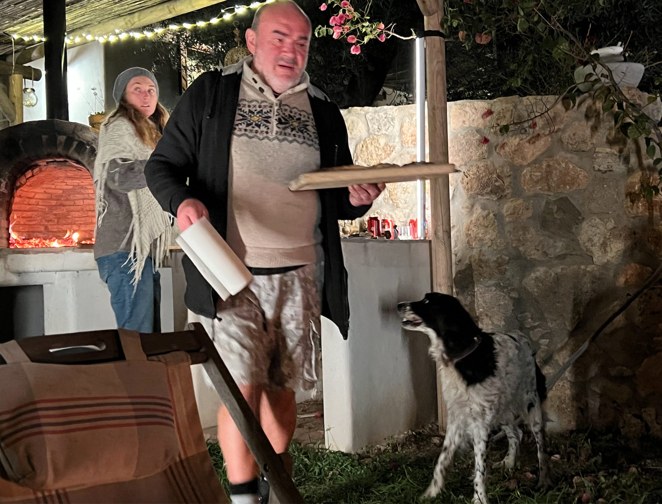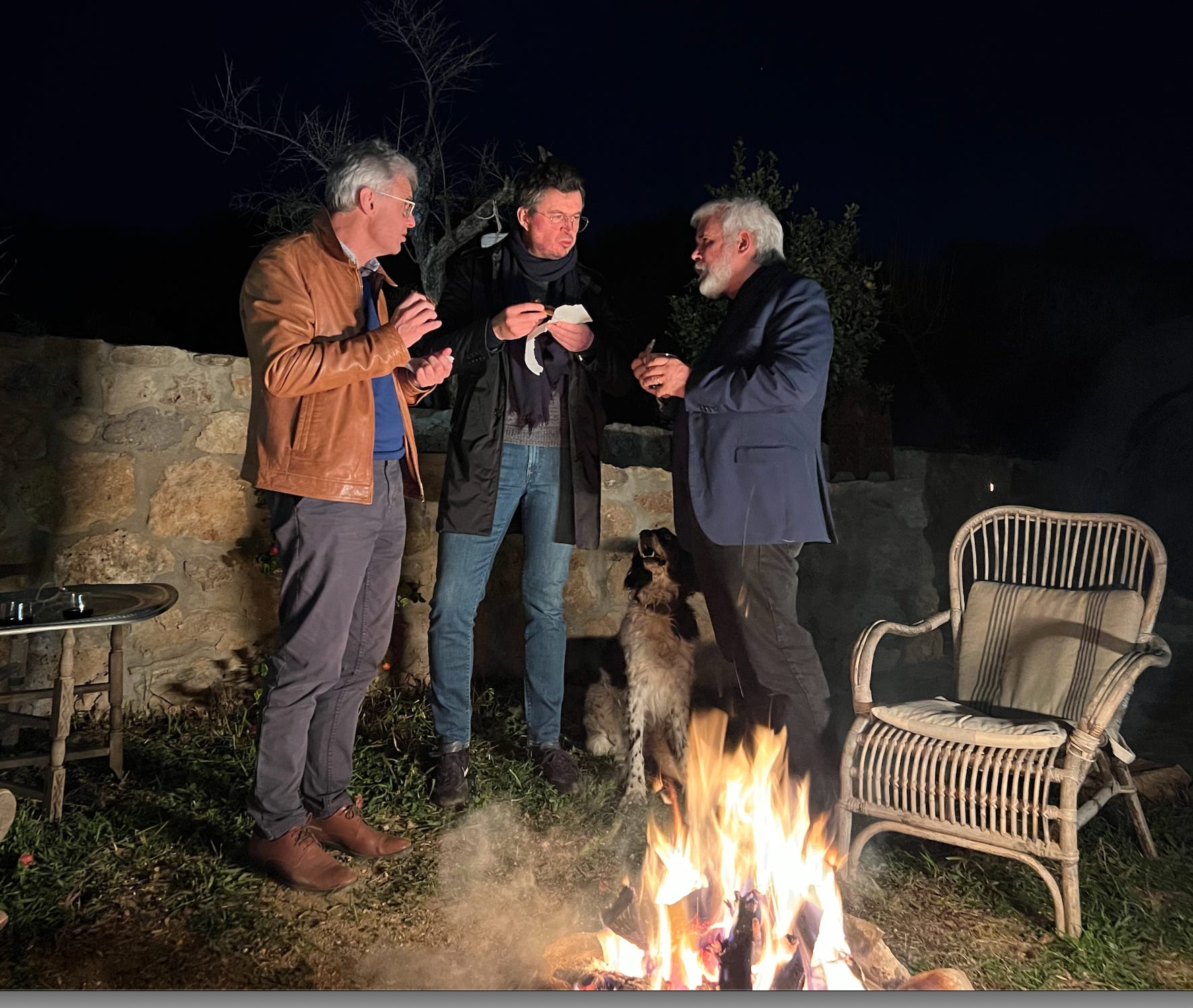 Geert, Mattias and I with unknown dog around a camp fire at the finca.