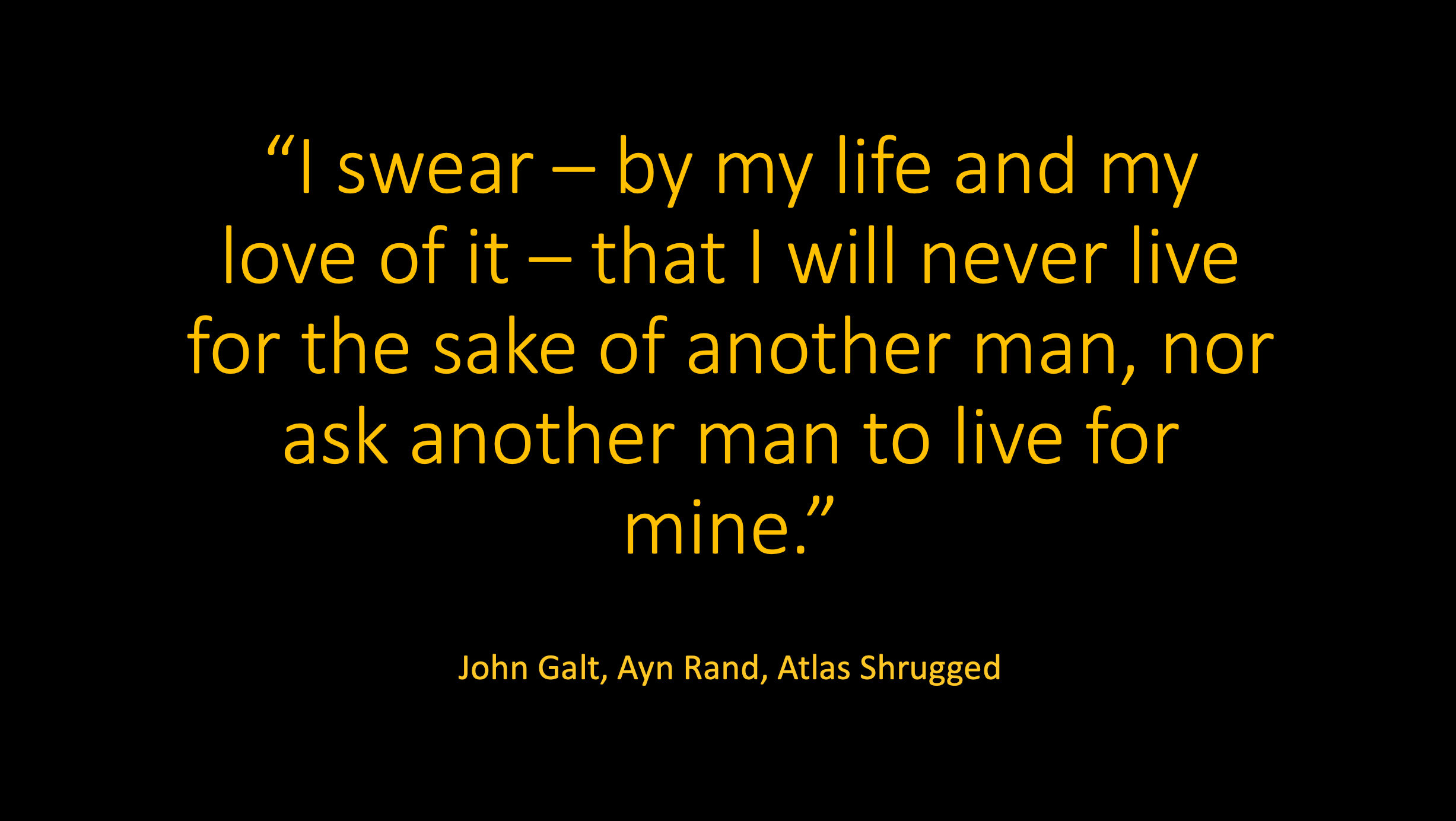 There is at least one key thing that Ayn Rand’s version of Galt’s Gulch fails to promote, and that involves development of a sense of selflessness and empathy as one of the core tenets of life. Selflessness and empathy have to be voluntary, these personality traits cannot be forced. Of course we must all hold ourselves personally responsible for both our own actions and the welfare of our families. That comes first. But I also believe that we also must respect that reciprocity is something that benefits all involved. Personal and organizational integrity, respect for human dignity, commitment to building community. You can come at this from the standpoint of empathy, or merely as transactional commerce. By helping my neighbor build his barn, one day he may help me fix mine. Not through a formalized contract, but by having a long-term relationship built on trust and work. Either way, we must all hang together or we will surely hang separately.