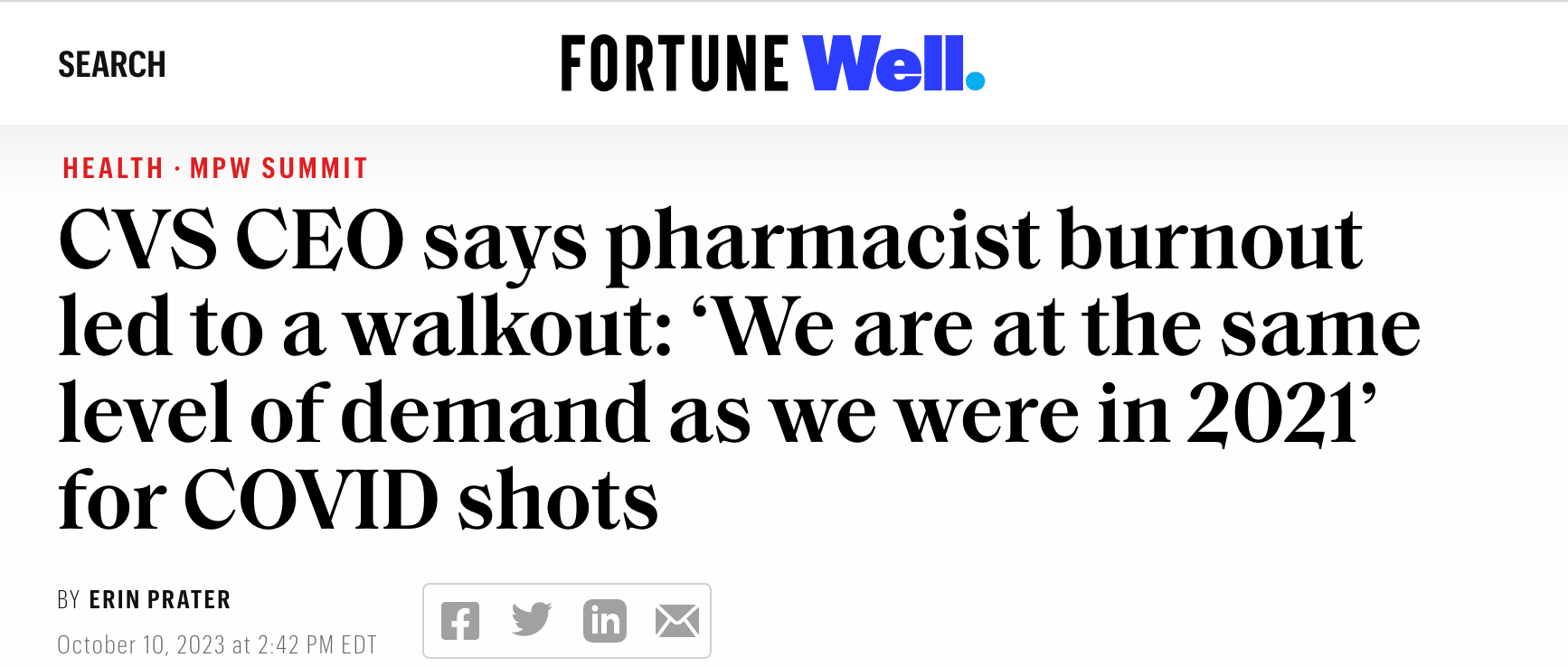 CVS and Walgreens pharmacy employees are walking out (pharmacists and others). One of the main reasons is that an “increased focus on vaccinations from management has added to their workload and made it more difficult to focus on filling prescriptions and customer care.”