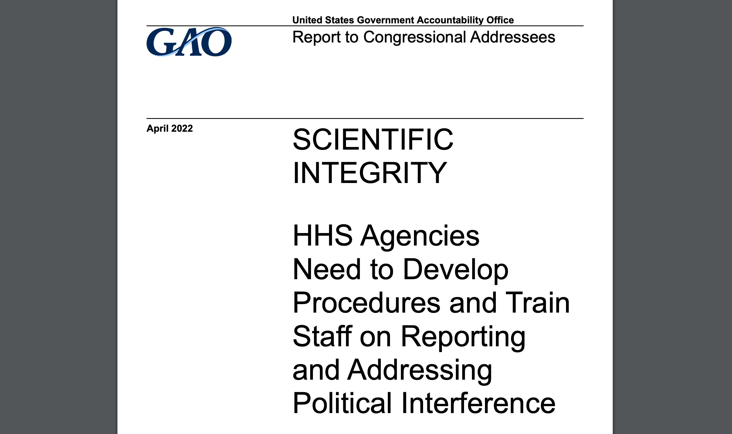 SCIENTIFIC INTEGRITY HHS Agencies Need to Develop Procedures and Train Staff on Reporting and Addressing Political Interference