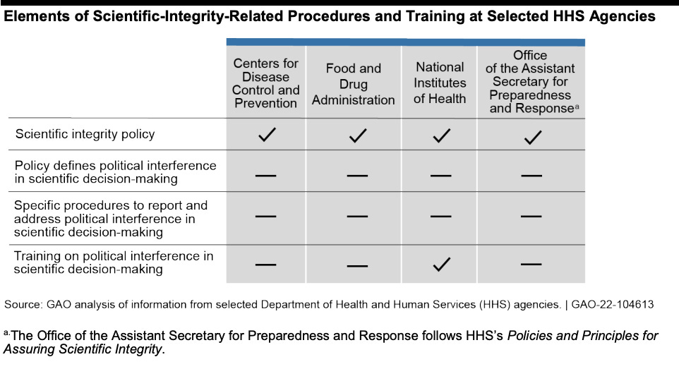 The four agencies GAO reviewed do not have procedures that define political interference in scientific decision-making or describe how it should be reported and addressed. These agencies within the Department of Health and Human Services (HHS) are: the Centers for Disease Control and Prevention (CDC), Food and Drug Administration (FDA), the National Institutes of Health (NIH), and the Office of the Assistant Secretary for Preparedness and Response (ASPR).