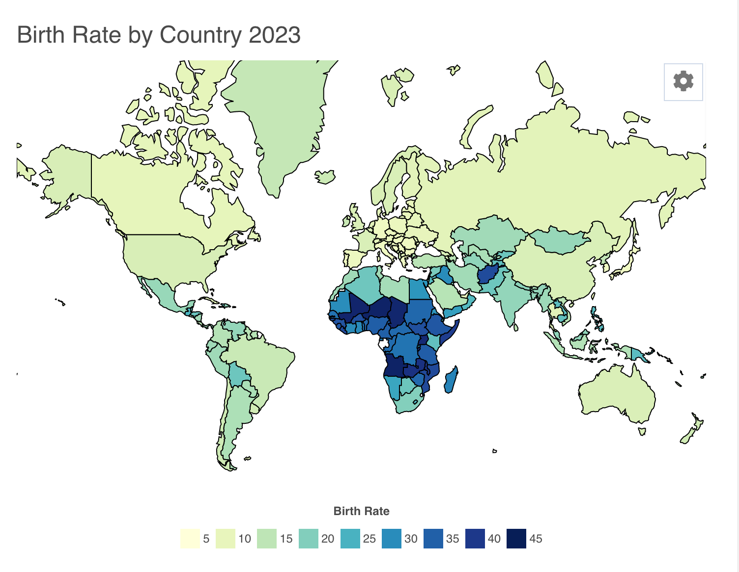 Worldwide birthrate per 1000 people follows a very predictable trend. In “developed” and/or wealthy nations, the birthrate is low and in nations at the lower end of the economic development scale, the birthrate is high. Nothing new there.