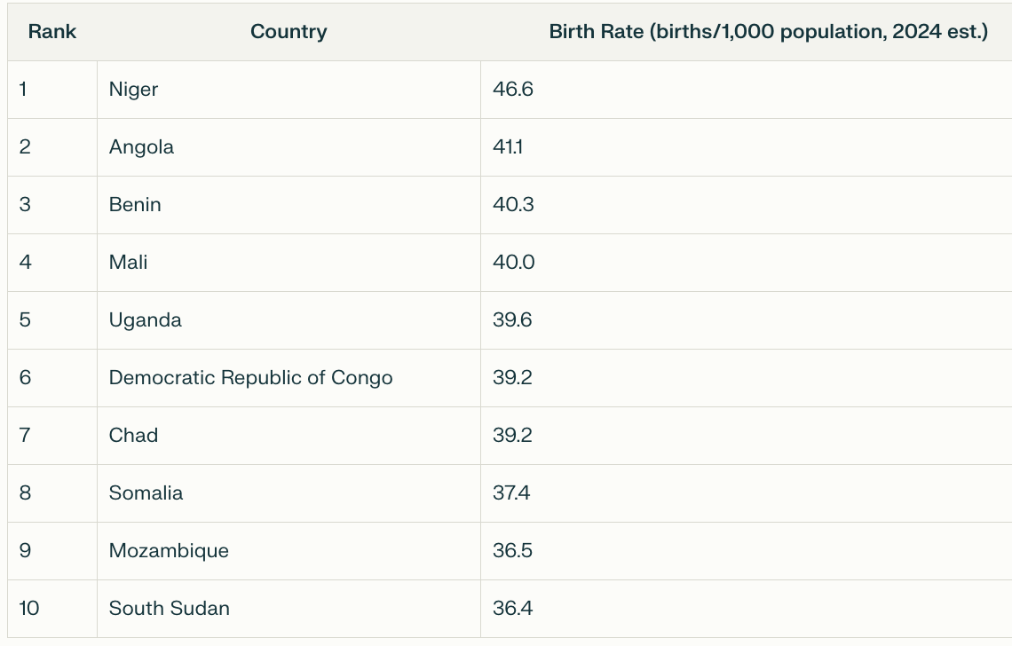 The top ten countries in the world with the highest birth rate (all found in Africa)