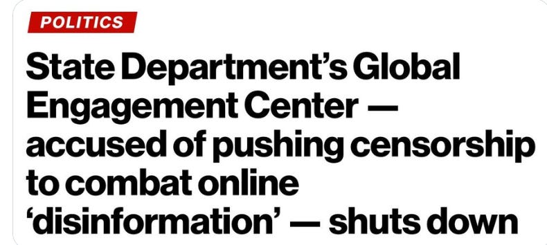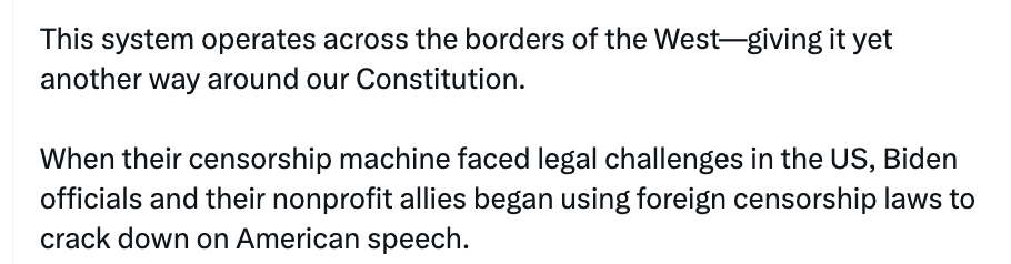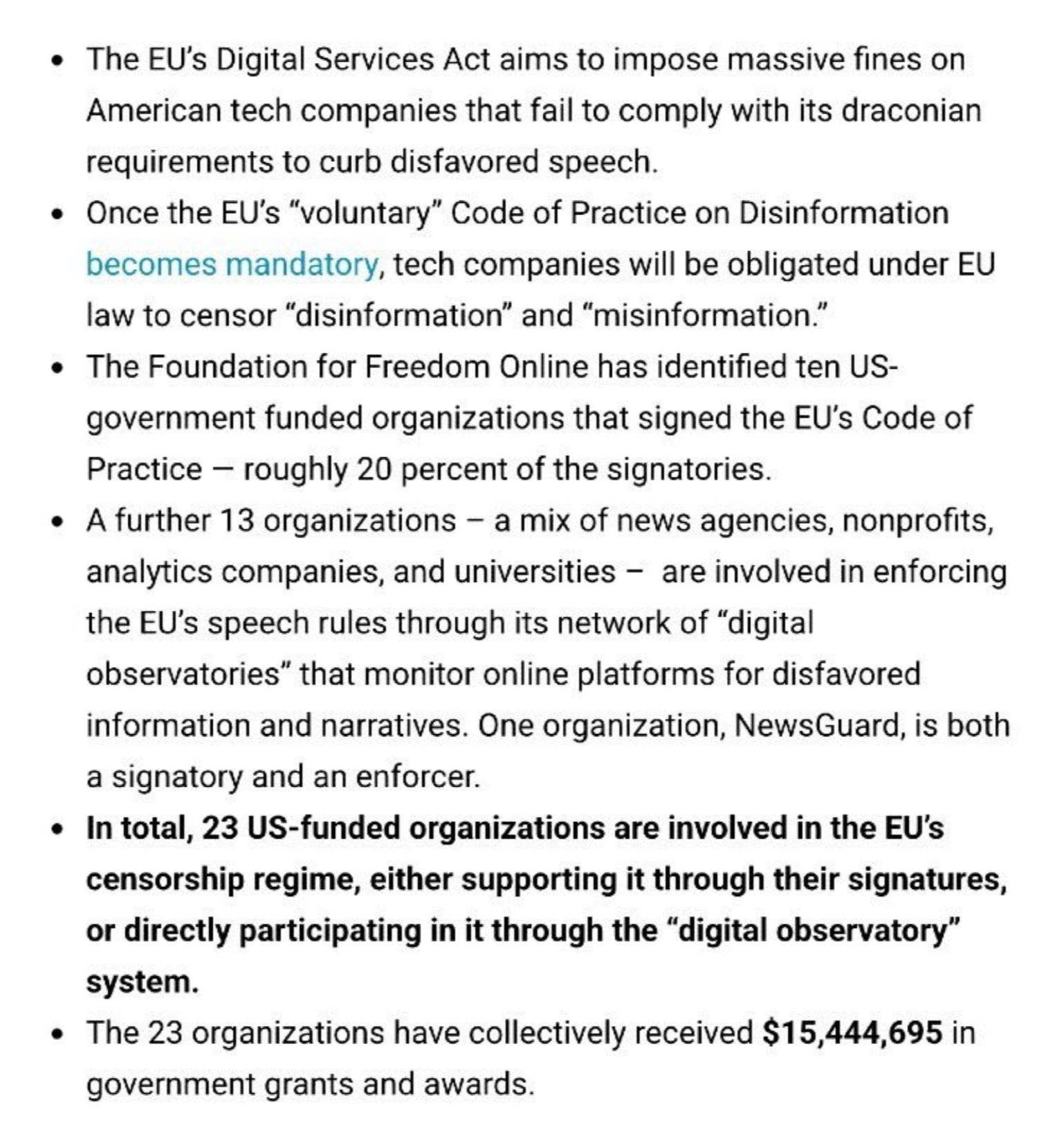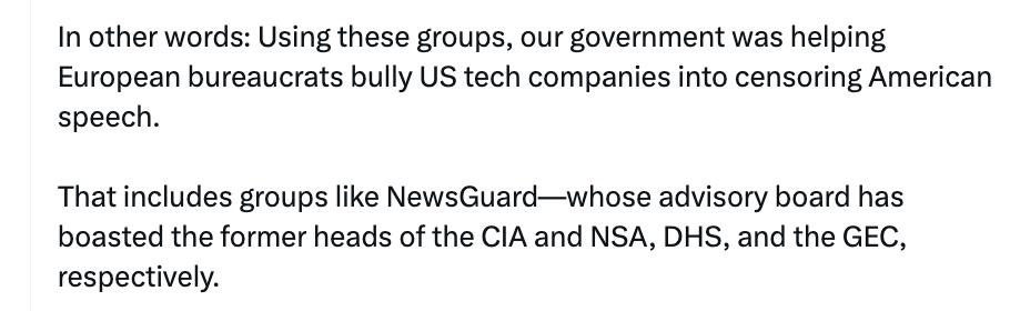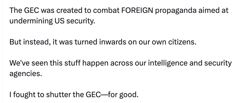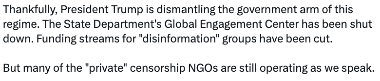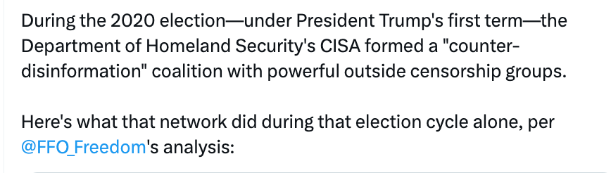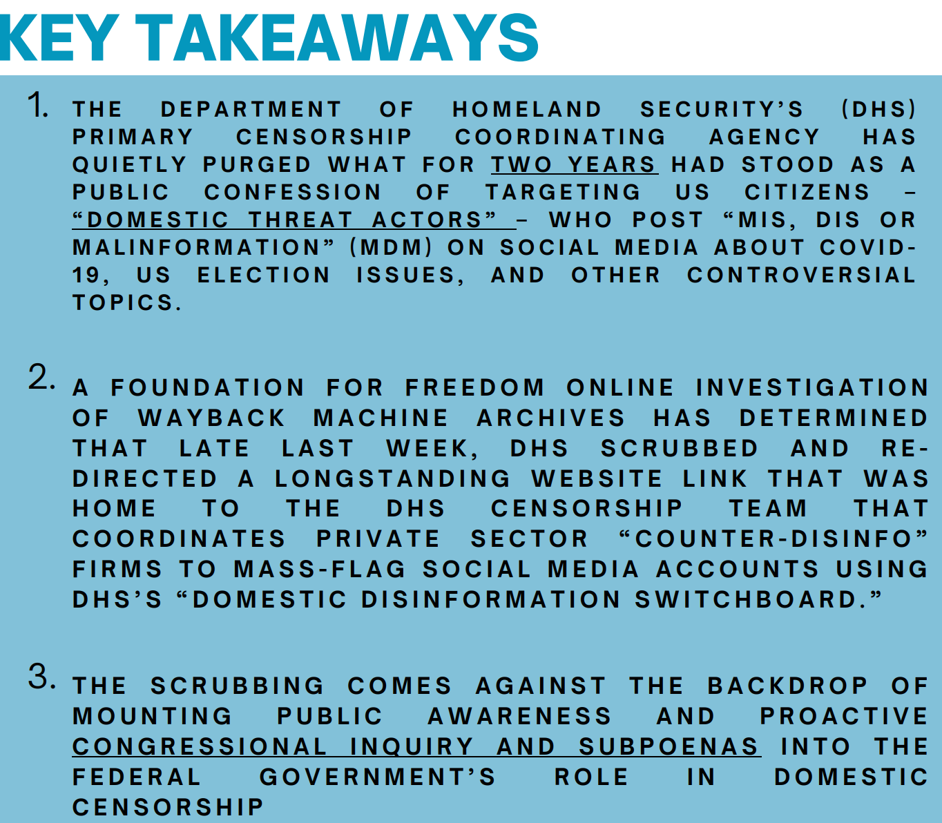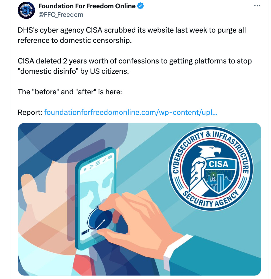 The Foundation for Freedom Online has a report online documenting as of last week, CISA has deleted all references to domestic censorship.