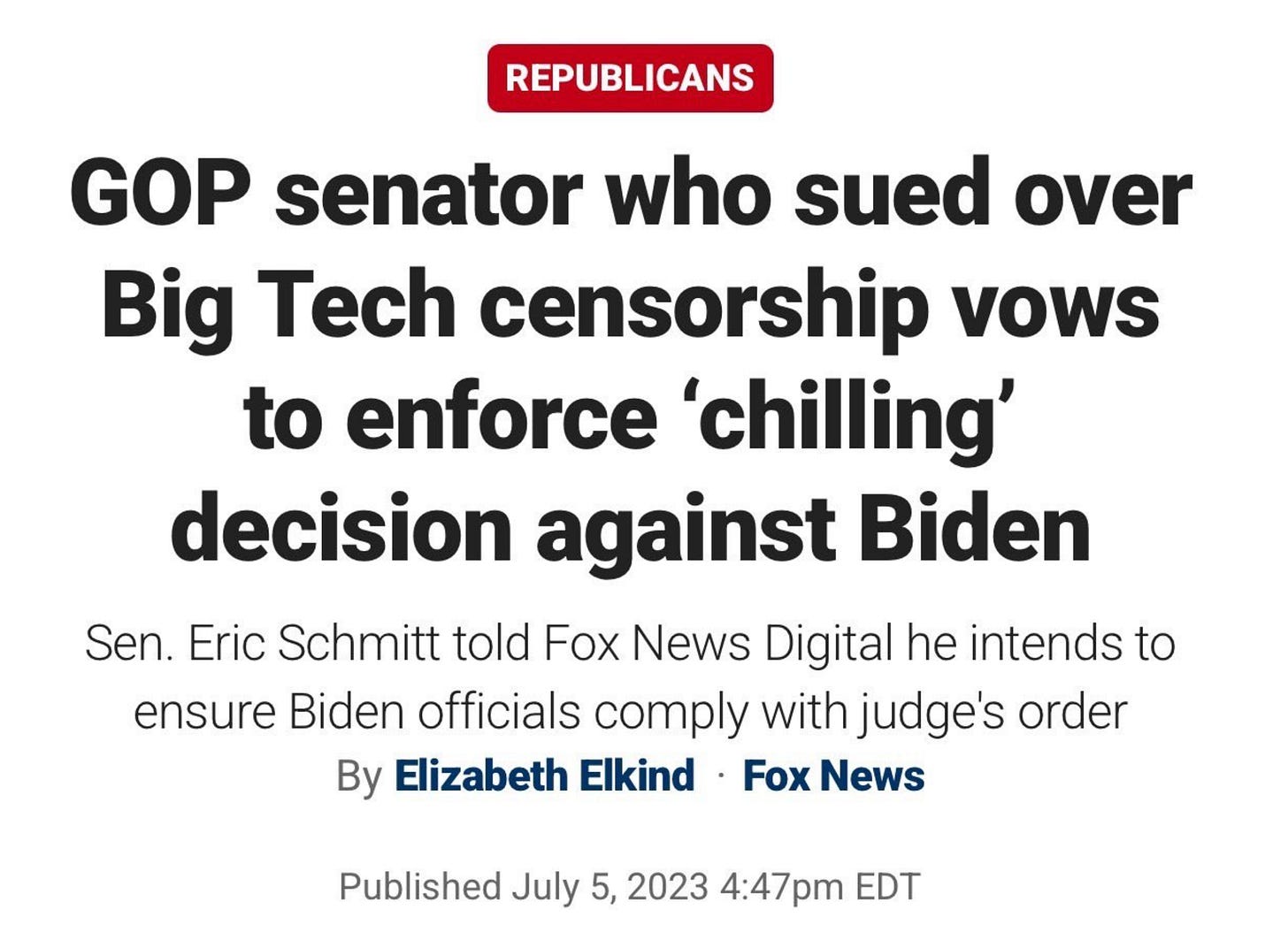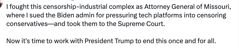Senator Eric Schmitt, as Missouri Attorney General, filed numerous lawsuits against the Biden administration regarding the censorship-industrial complex during the CovidCrisis. He has been a true hero in this fight for American freedoms.