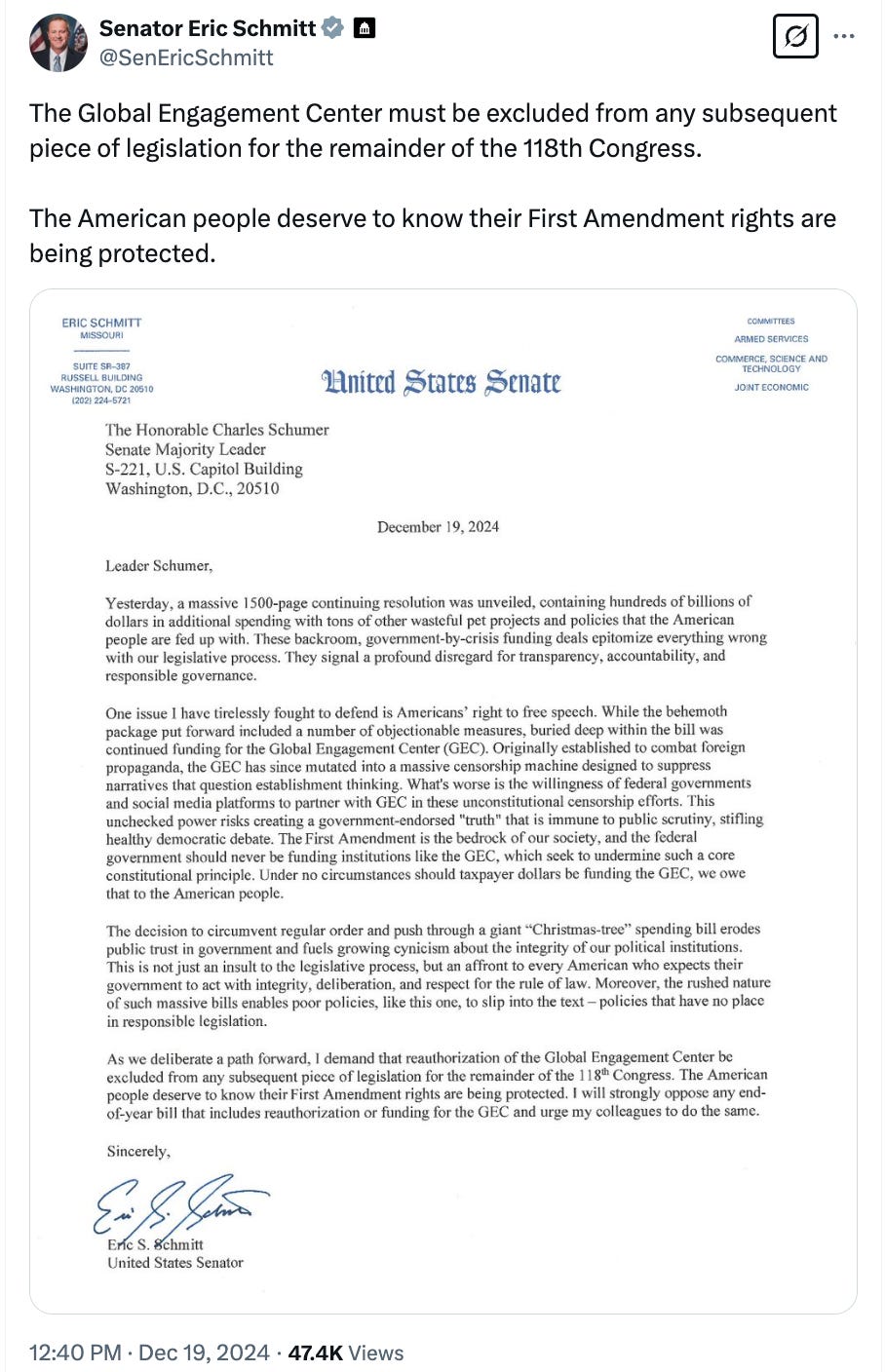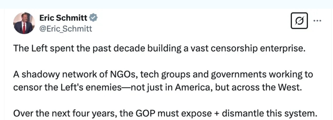 Yesterday on X, Senator Schmitt outlined in a series of tweets what the government, NGOs, and Academia have been doing to us over the past four years. When read as a complete document, what has happened to us is mind-blowing.