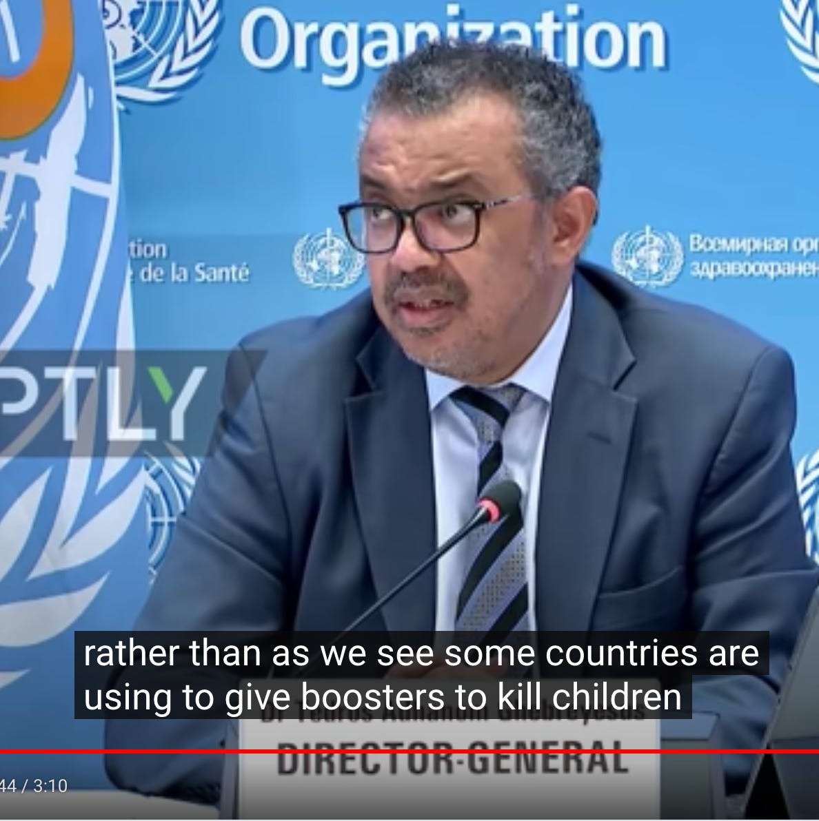 Press Conference: WHO Chief Dr. Tedros"As we see, some countries are using to give boosters to kill children. Which is not right" -Dr. TedrosDr. Robert W. MaloneDec 22, 2021∙ Paid238401ShareThe above photo is a screen shot of google closed caption.Please have a listen to the following video -This post is for paid subscribersSubscribeAlready a paid subscriber? Sign inPreviousNext