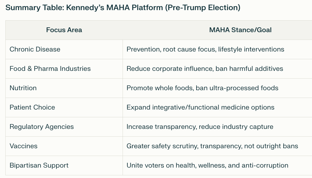 “During Robert F. Kennedy Jr.’s independent presidential campaign—before Donald Trump’s election—the term MAHA ("Make America Healthy Again") stood for a broad, populist health reform agenda centered on several key themes:
