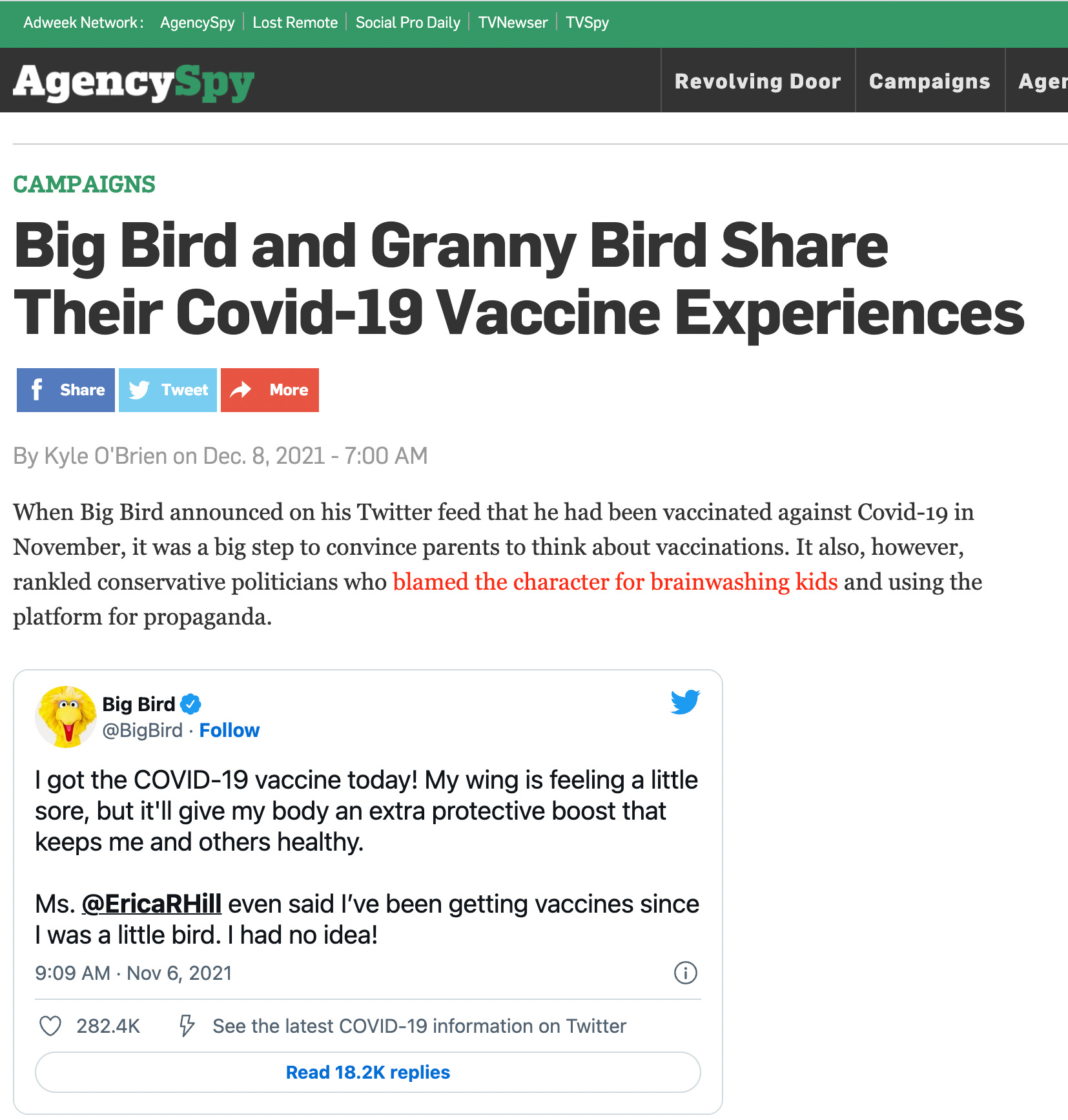 In a new campaign by Sesame Workshop, WarnerMedia and the Ad Council, Big Bird and Granny Bird talk about how getting the shot may have made his wing hurt a little, but it was the right thing to do to keep everyone safe and healthy.