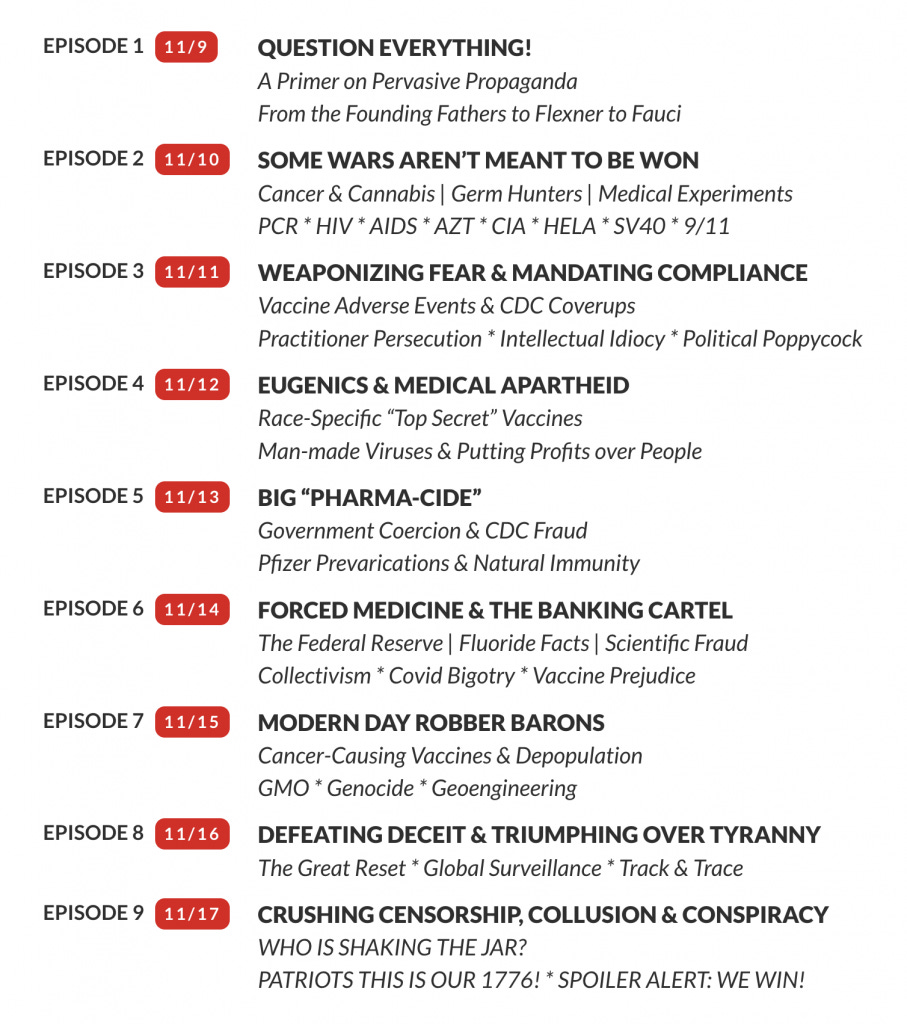 This docu-series will cover everything from cancer and cannabis to fluoride and the Federal Reserve. Most importantly, it will expose the TRUTH about COVID, vaccines, and the real-life conspiracies that are actively underway RIGHT NOW.