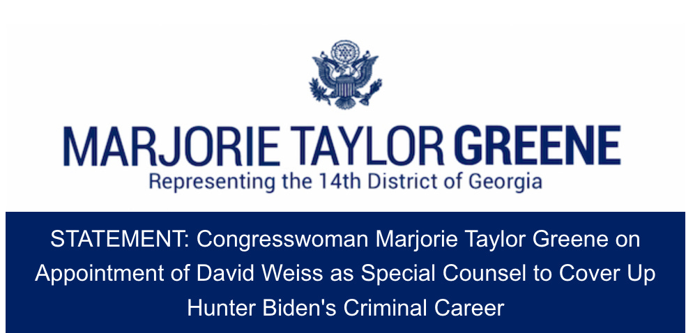 WASHINGTON D.C. — Congresswoman Marjorie Taylor Greene issued the following statement following today's appointment of Davis Weiss as Special Counsel to cover up Hunter Biden's criminal career: