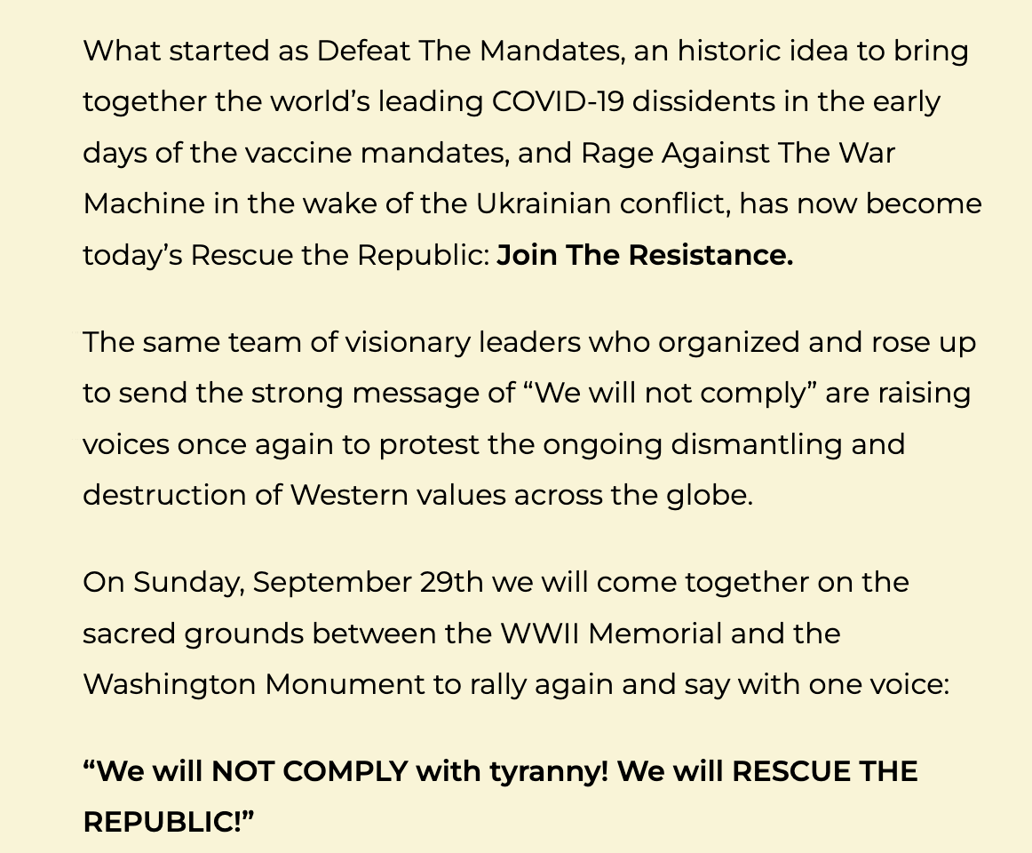 This will be a historic protest rally, a follow up to the pivotal “Defeat the Mandates’ rally, with a great line-up of speakers and musicians - and I hope as many people as possible can attend!