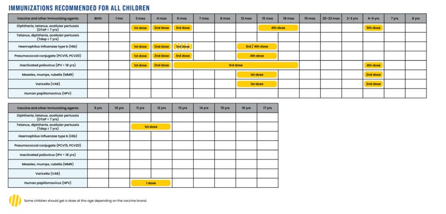 Figure 1: Proposed immunization schedule from birth up to age 18, with recommendations for all children (yellow), recommendations for high-risk groups or populations (purple), and immunizations with shared clinical decision-making (blue), all available and covered by insurance for all children and adolescents without cost sharing.