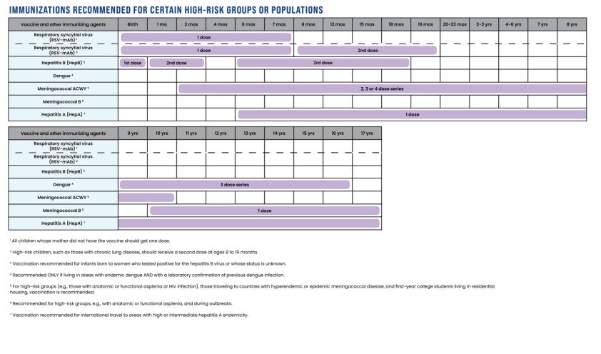 The immunizations recommended for certain high-risk groups or populations are for respiratory syncytial virus (RSV), hepatitis A, hepatitis B, dengue, meningococcal ACWY, and meningococcal B.