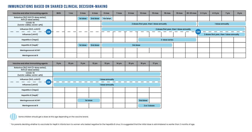 The immunizations based on shared clinical decision-making are for rotavirus, COVID19, influenza, meningococcal disease, hepatitis A, and hepatitis B.