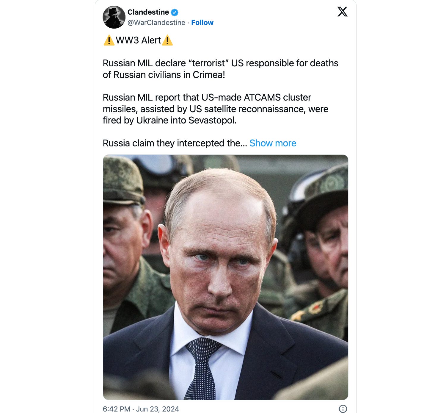Russian MIL declare “terrorist” US responsible for deaths of Russian civilians in Crimea! Russian MIL report that US-made ATCAMS cluster missiles, assisted by US satellite reconnaissance, were fired by Ukraine into Sevastopol.