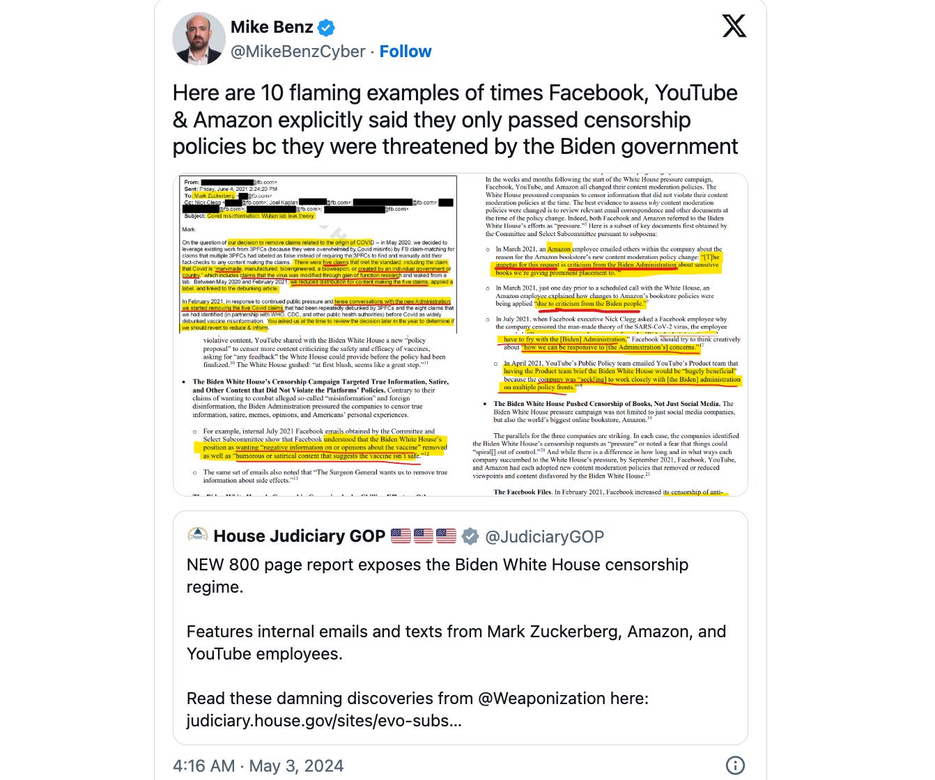 After 1991, they didn’t pack up that toolkit; instead, they started employing it against conservatives, nationalists, and Christians who bucked the agenda of secular globalists. Remember how YouTube promised to censor anyone who disagreed with the WHO during the COVID panic? How Facebook agreed when the CIA told it to silence talk about Hunter Biden’s laptop until after the 2020 election? Those weren’t outliers. They were the Matrix working as intended. (Below is an image of Mike Benz’ Twitter post, documenting 10 examples of the times that social media giants explicitly said they passed censorship policies because they were threatened by the Biden government.)