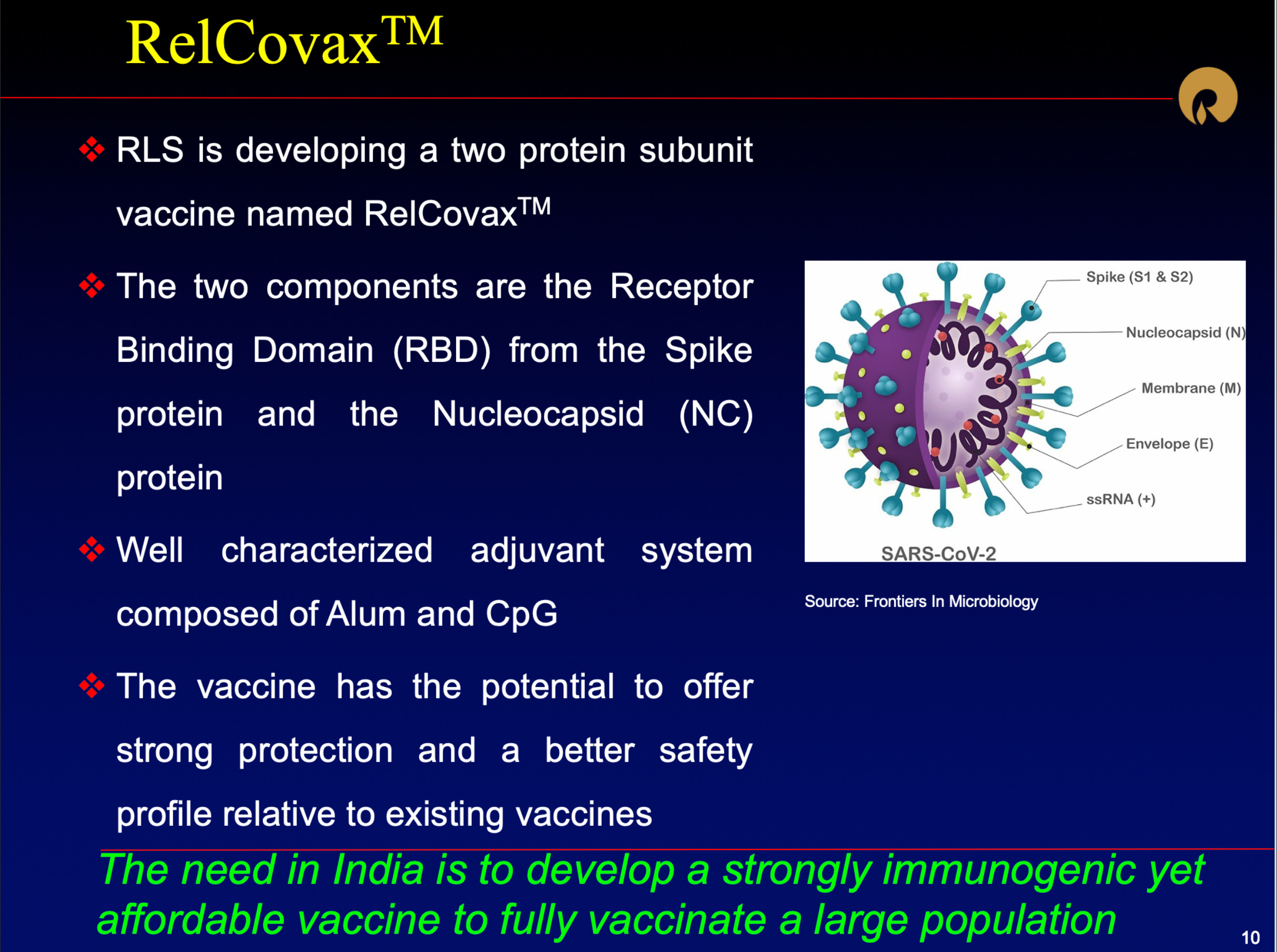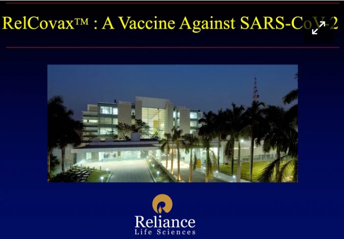 And so they created this company Reliance Vaccines, and in that process hired me to be a consultant. Basically on a weekly basis, I would dial in the middle of the night to a Zoom call with this team that was starting to form of expert vaccinologists in India. And at one point, as this whole thing developed, there was a corporate decision to try to build a low cost simple COVID vaccine for the poor. And that simple vaccine had two antigens in it, neither of which are full length spike. It's made now, <for clinical trials> and you can see the slide deck that I talked about.